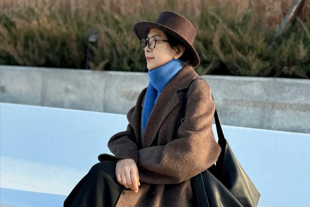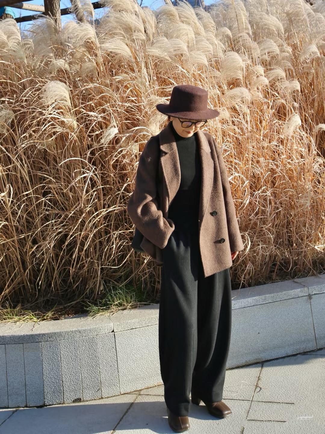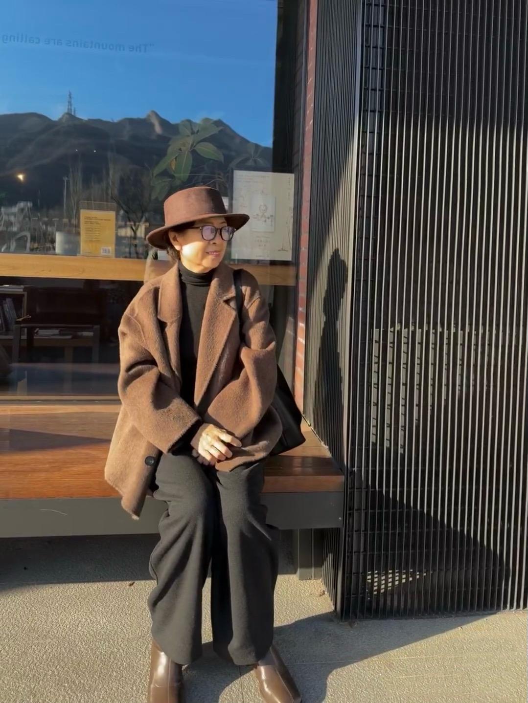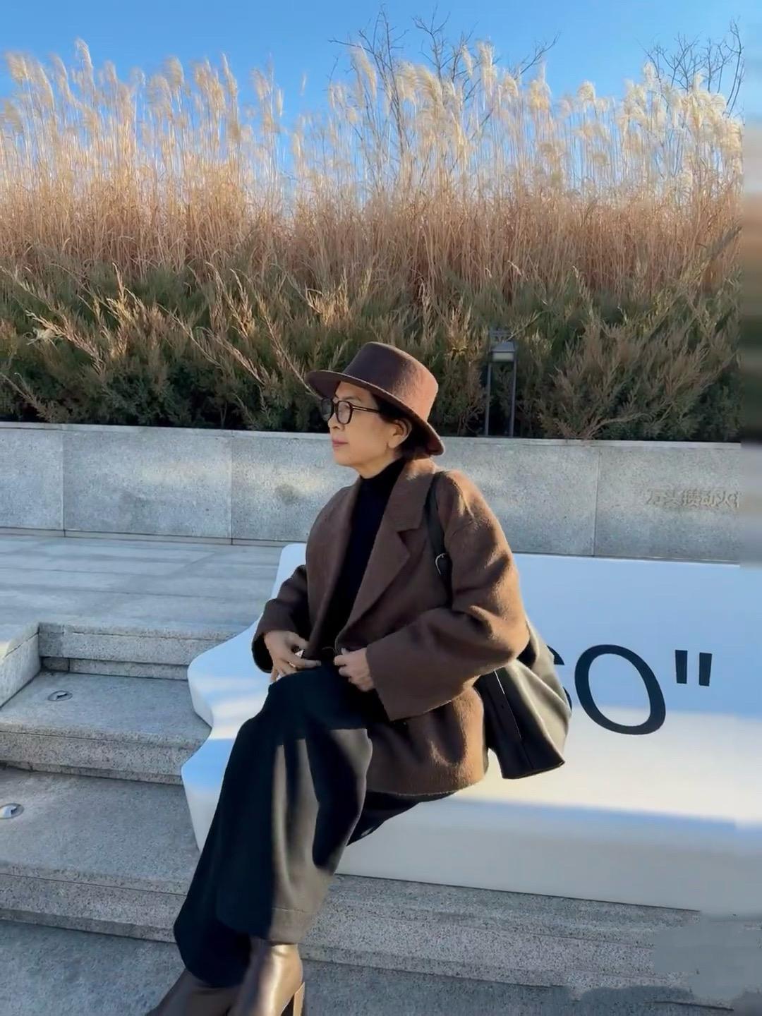 比如這種焦糖色的呢大衣,可以配寬鬆的闊腿褲。上了年紀,闊腿褲一定更有包容性,穿起來很大方、也不會邋遢顯腿粗。