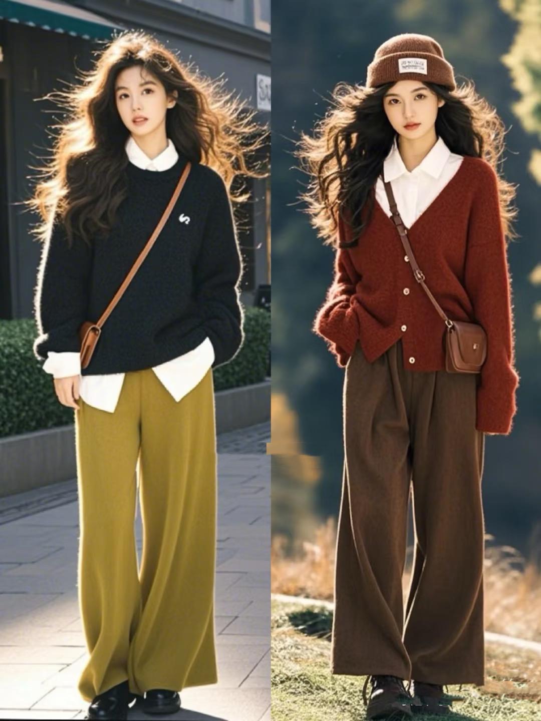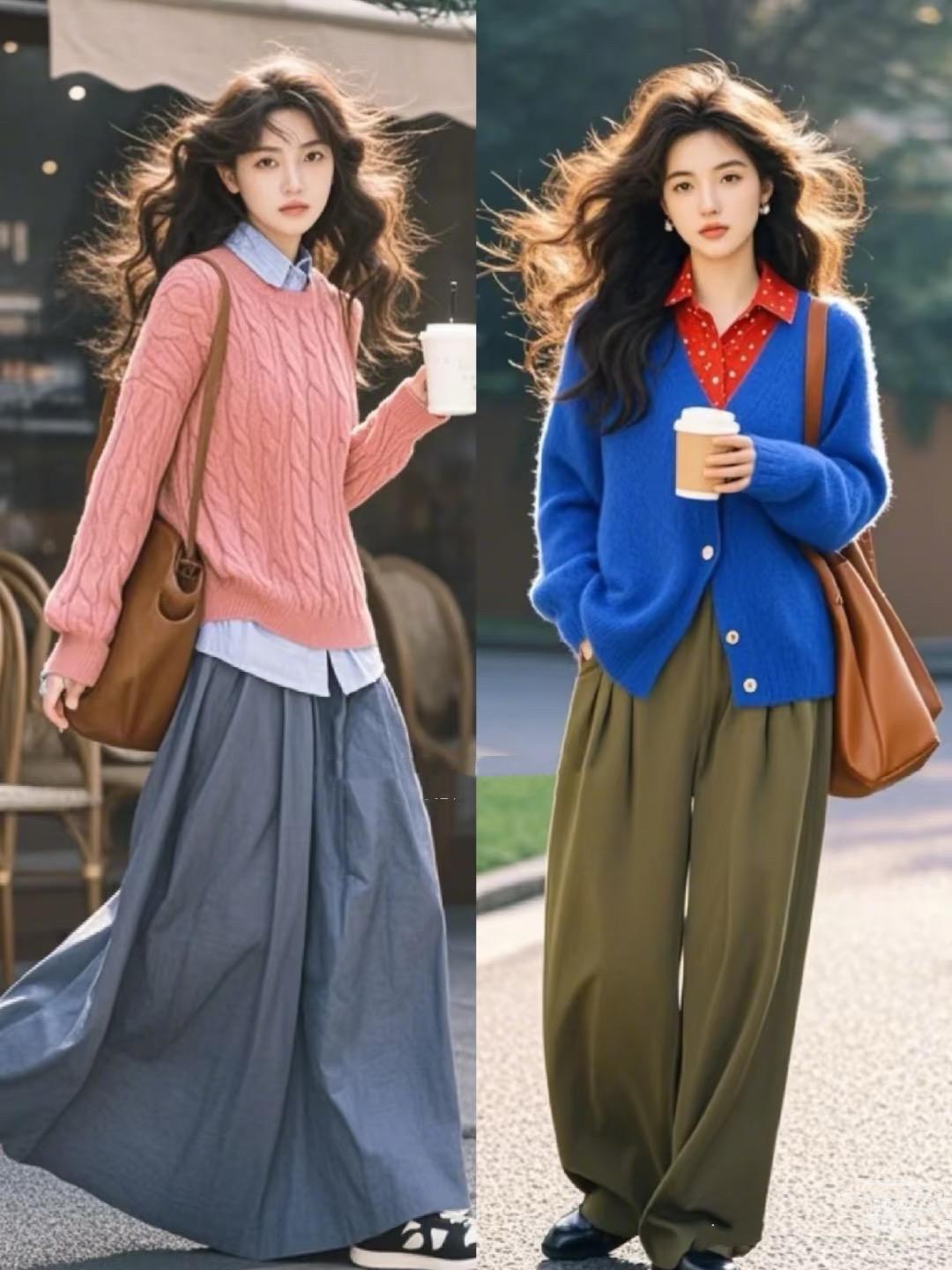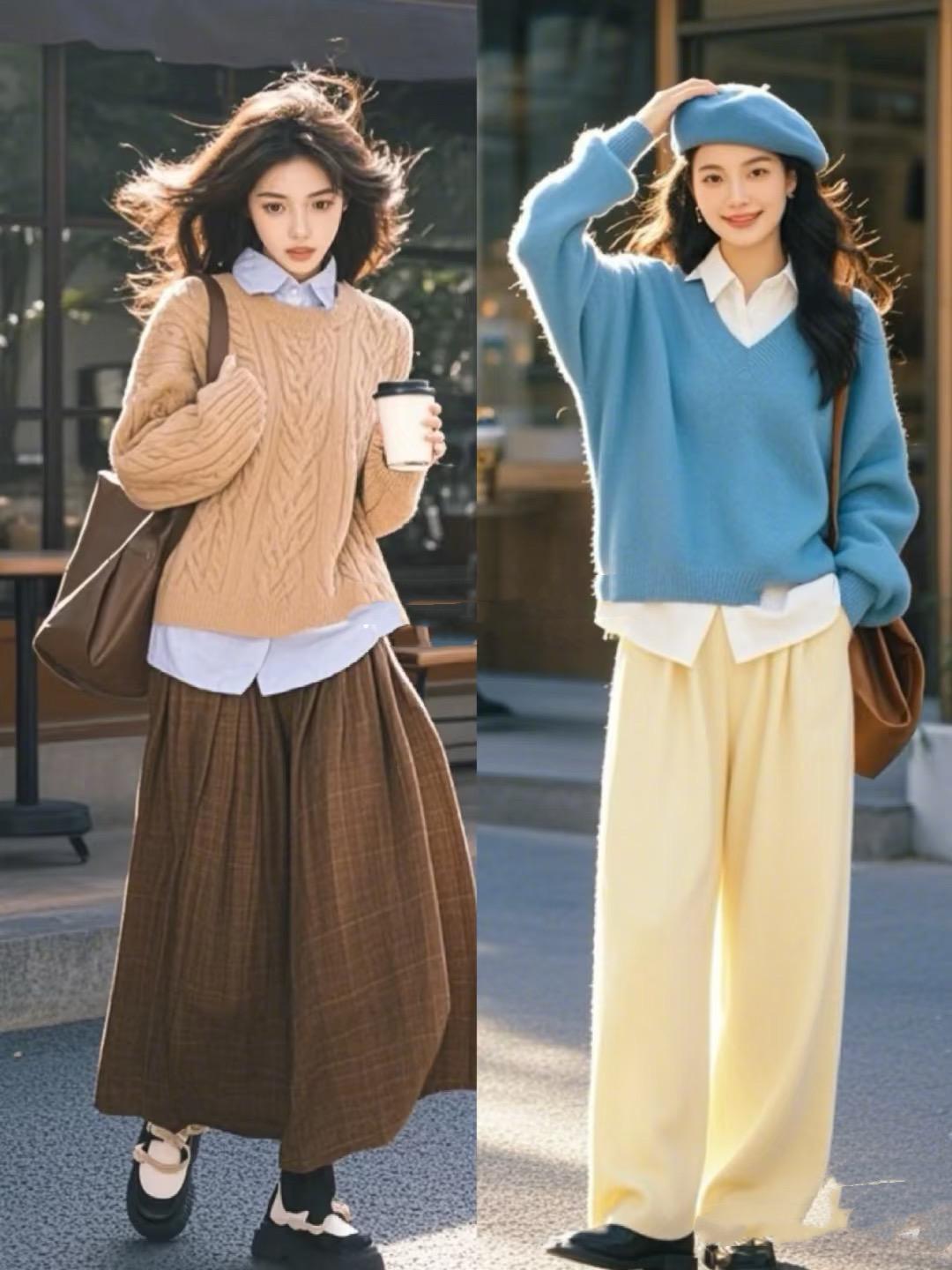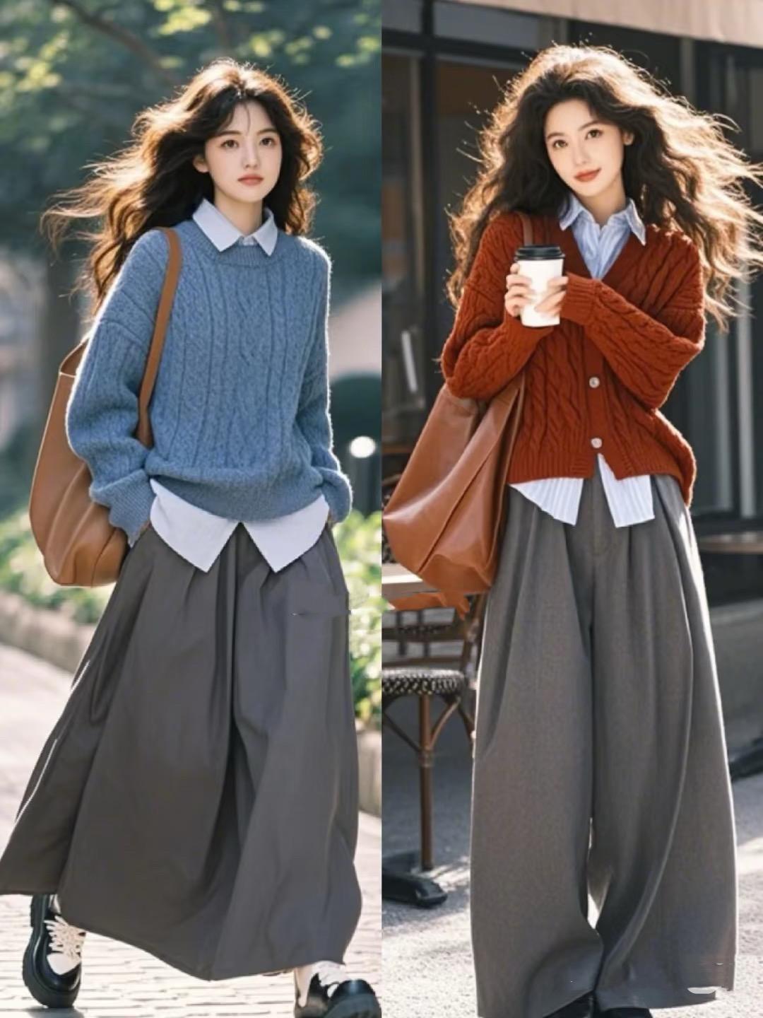 這個冬天,當我們穿着毛衣+襯衫的時候,可以配寬鬆的傘裙、也可以搭配高腰的闊腿褲,簡潔又時尚。
