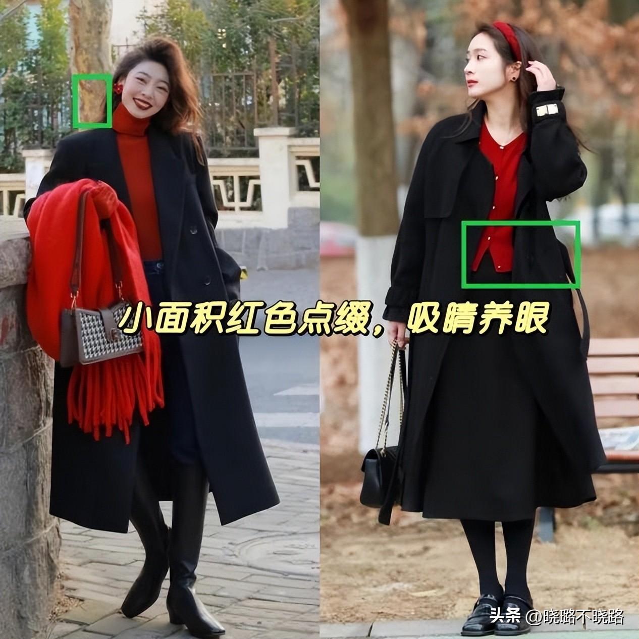 將紅色集中在圍巾帽子和鞋子這些小物件上,避免出現過於乍眼的感覺,同時提亮整體的色調,現在穿搭更加時尚高級。比如紅色圍巾加黑色大衣,或者紅色高跟鞋配黑色的拖地褲,一舉一動之間釋放出優雅感。