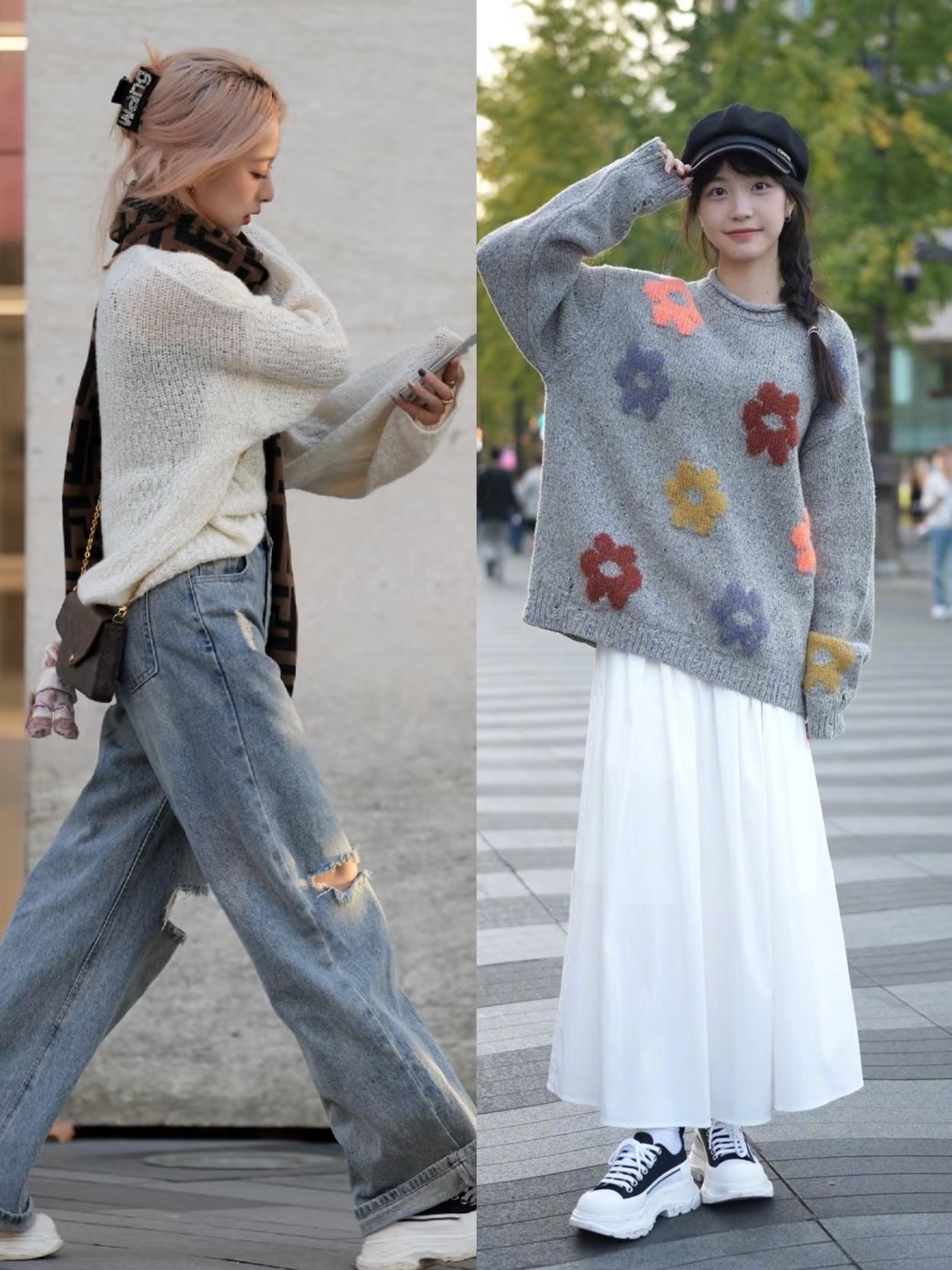 毛衣也可以大一點,寬鬆肥大一點的毛衣更適合營造鬆弛慵懶的美。那種寬鬆與自在,真的太養眼了。寬鬆的大毛衣,配上白色半身裙,好美好減齡。