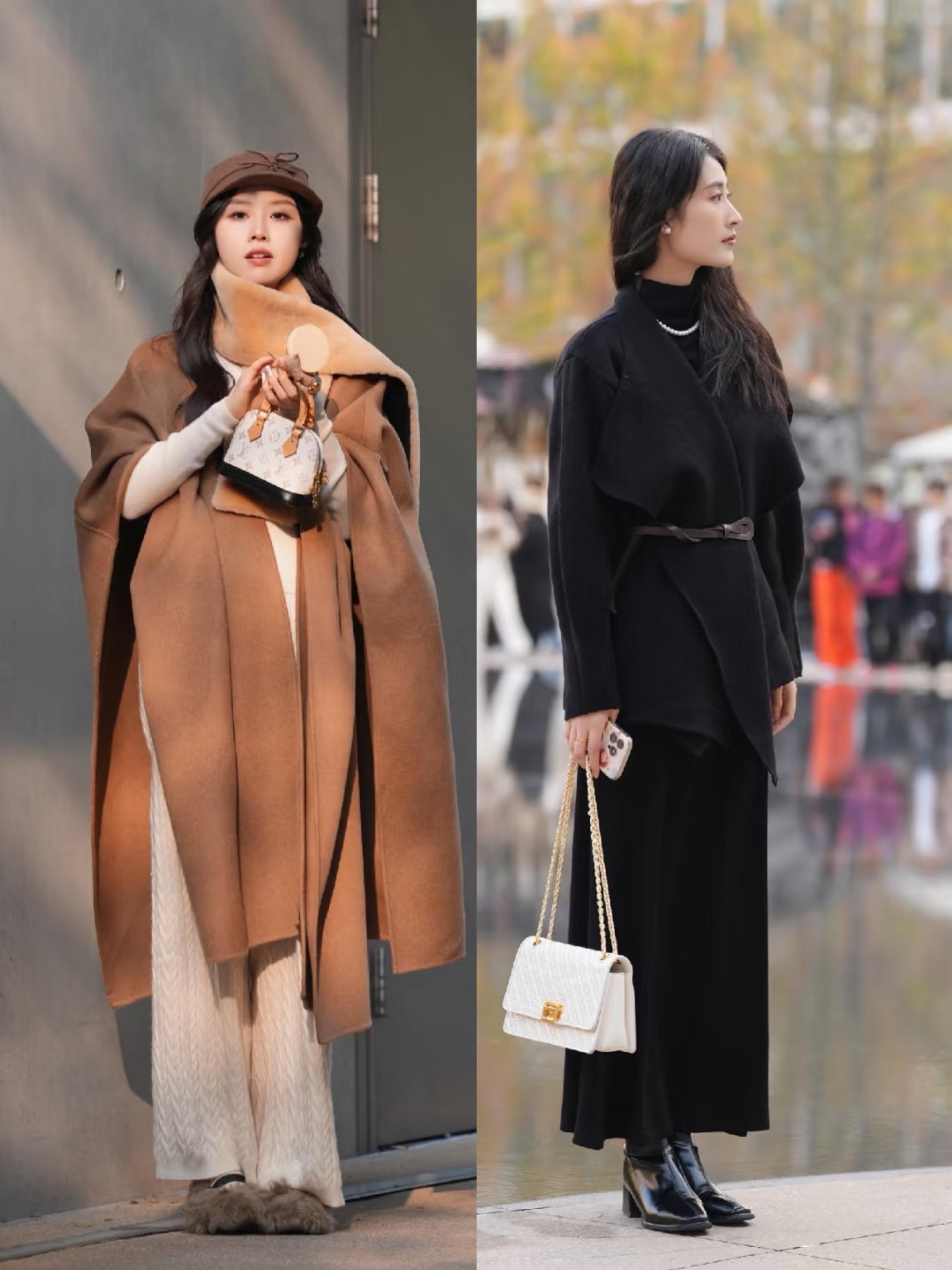 這樣的大衣,儘量配修身的打底衫來穿,修身打底衫不會有膨脹感,穿起來更利落也顯瘦。尤其是斗篷大衣露出手臂,需要配修身打底衫才更利落。