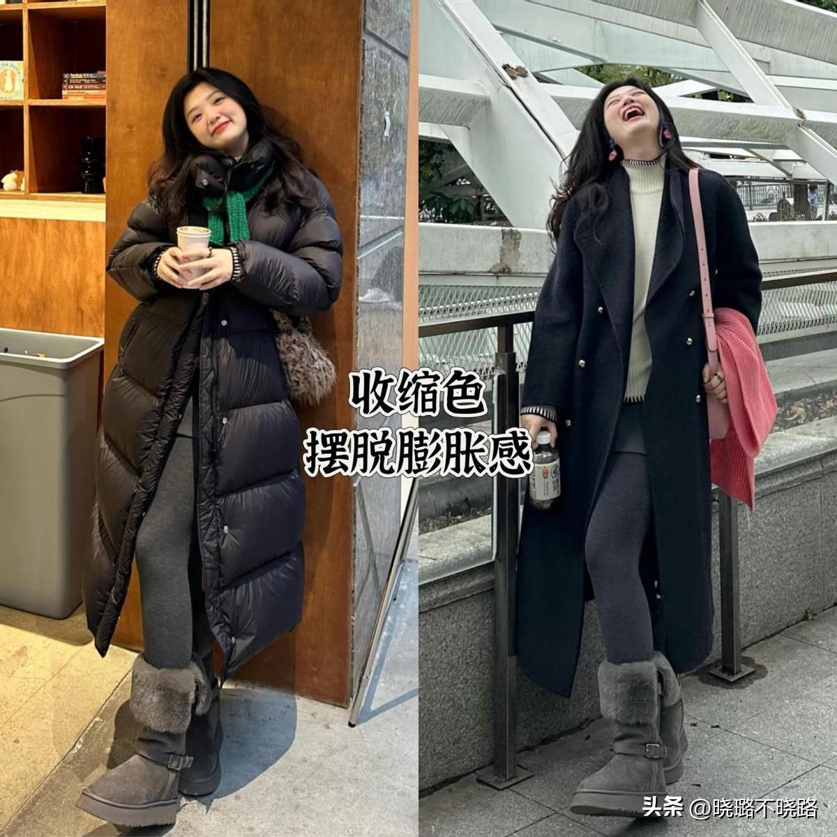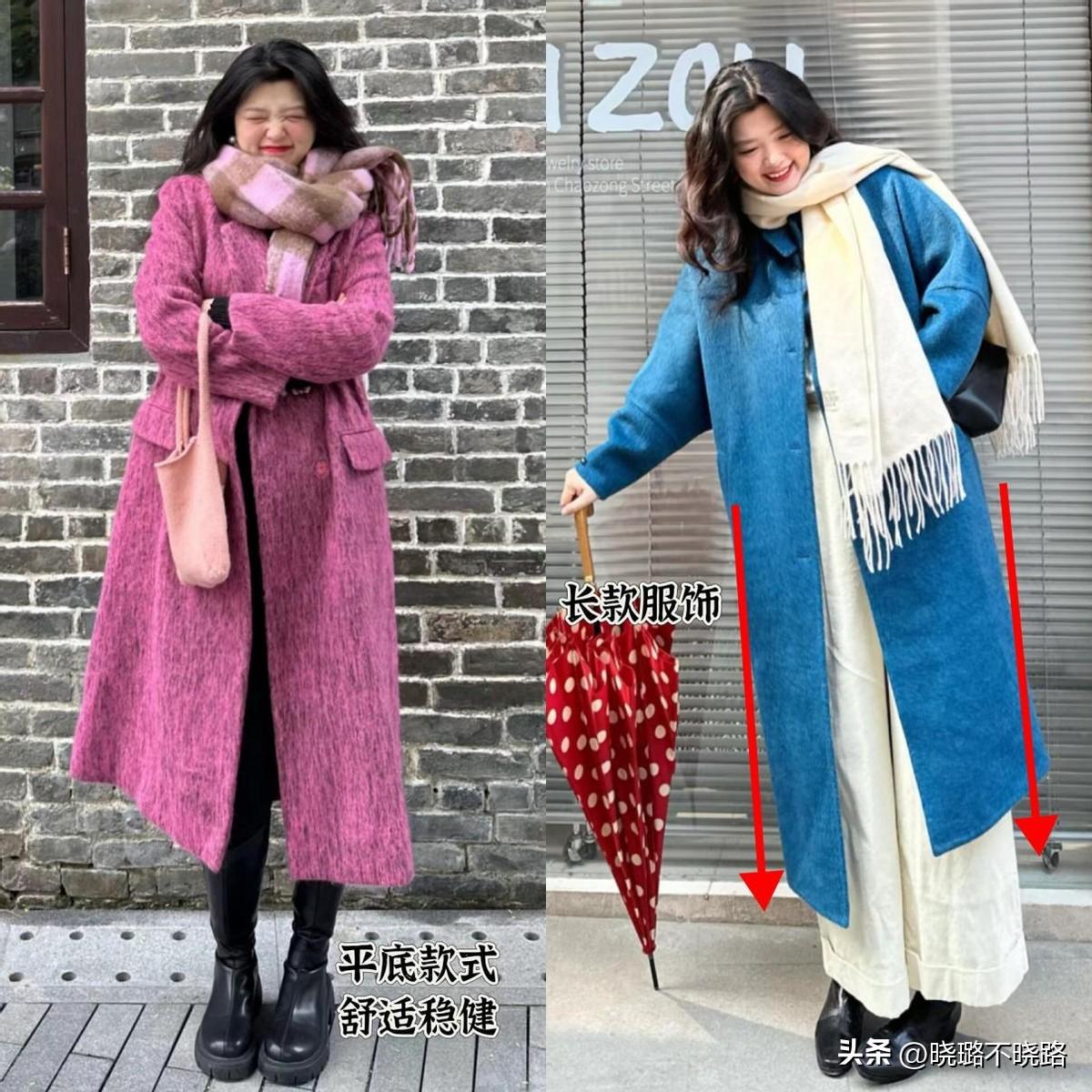 搭配長款大衣、羽絨服或者羊羔絨外套時,儘量不要選擇過於輕便的平底鞋,否則會有“頭重腳輕”的感覺,建議微胖女生可以選擇一雙“瘦瘦靴”,靴筒高度不過膝蓋,鞋底帶點厚度更好看。