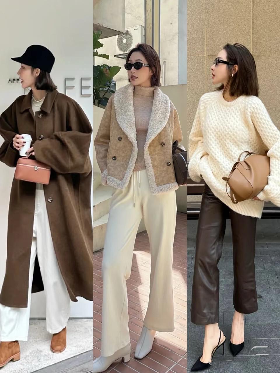 喜歡乾淨溫柔的美,我們可以用板栗色的大衣、來搭配白色闊腿褲。也可以用板栗色皮褲配白色毛衣。