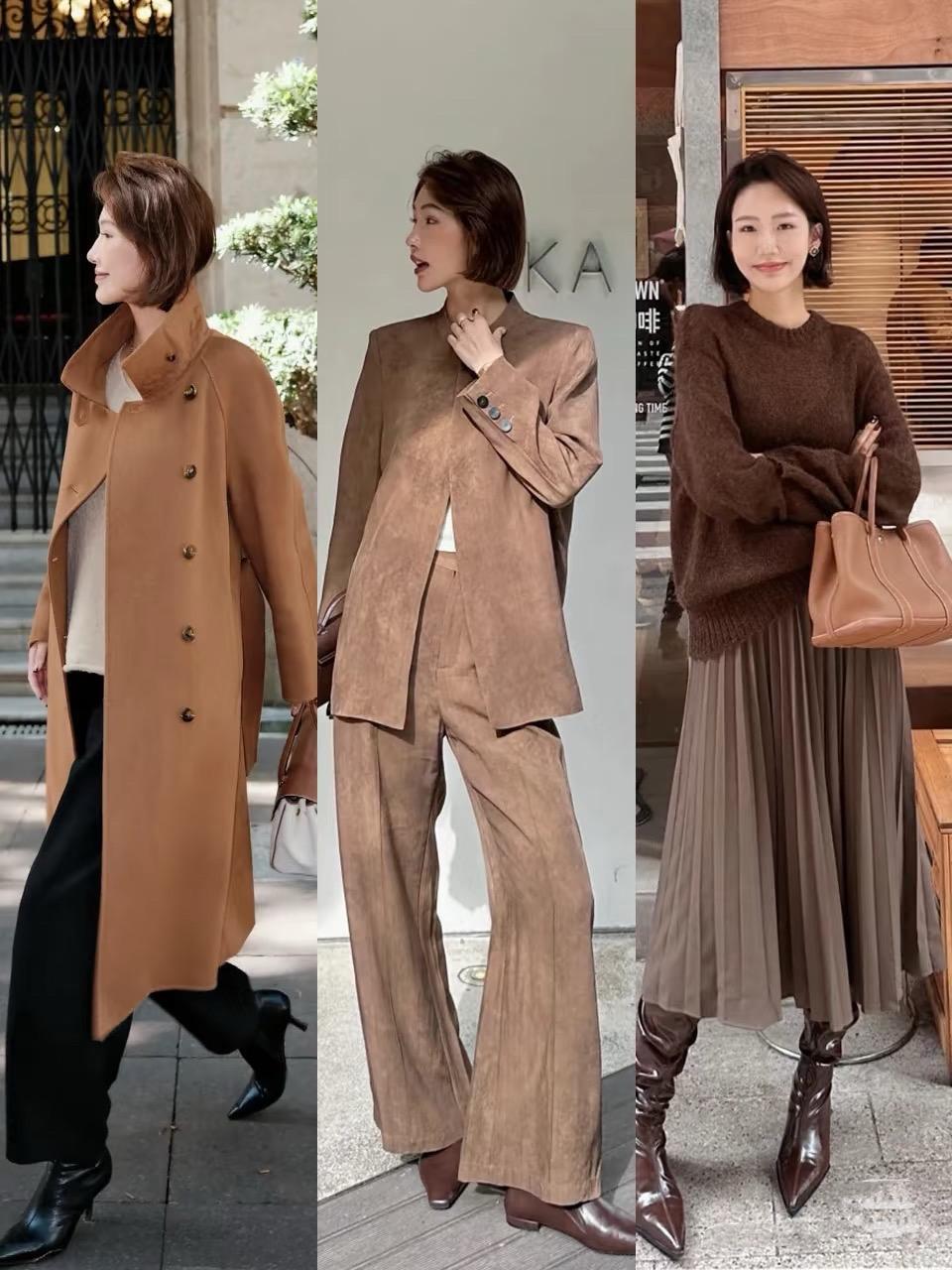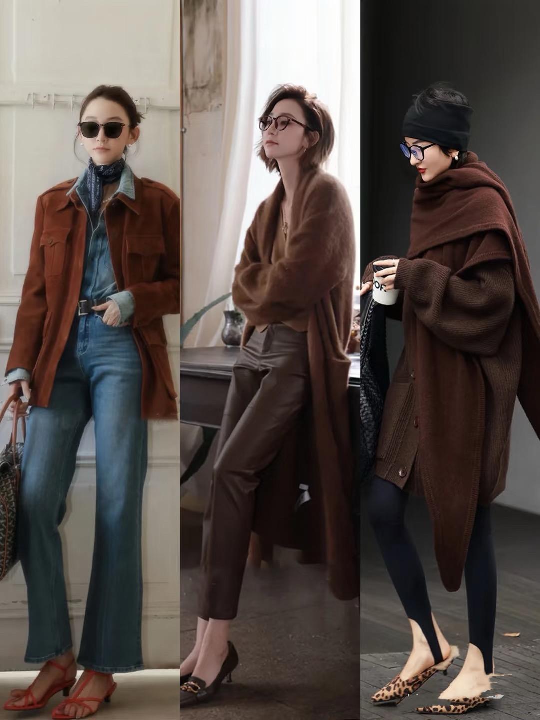 如果實在擔心穿衣配色上出錯,完全可以參考不同明度板栗色的搭配。其實同色系或者鄰近色的組合,都是溫暖且高級的。
