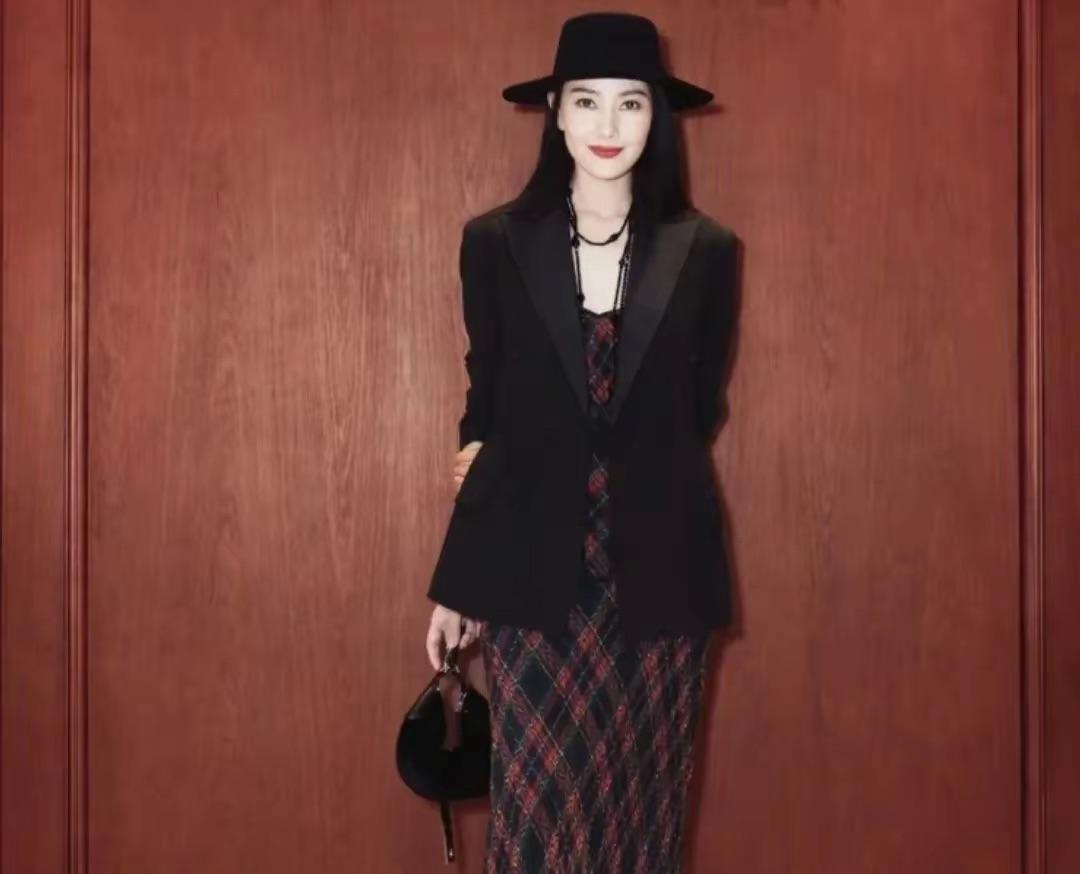 高圓圓就像是盛裝歸來的時髦女郎,黑色西服配收腰的菱格連衣裙,美得那麼明媚大方。