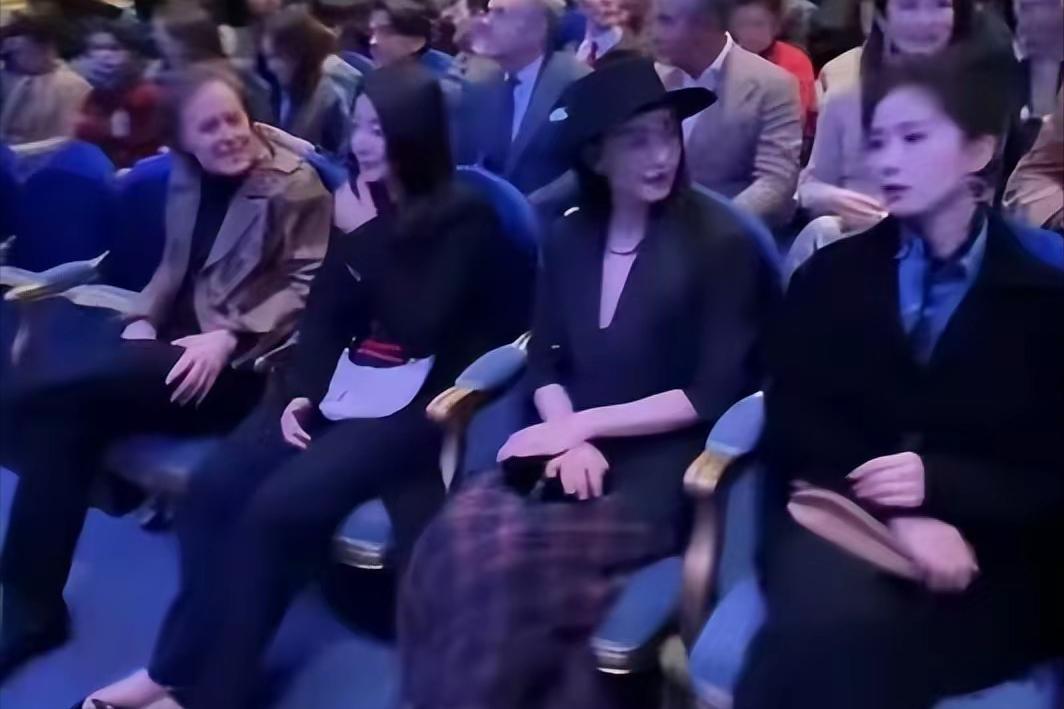更幸運的是,這三位美女坐一排,也是要養眼了。高圓圓帶着小禮帽、旁邊是穿牛仔襯衫有點拿範的劉詩詩,另一側的郭晶晶低調而從容。