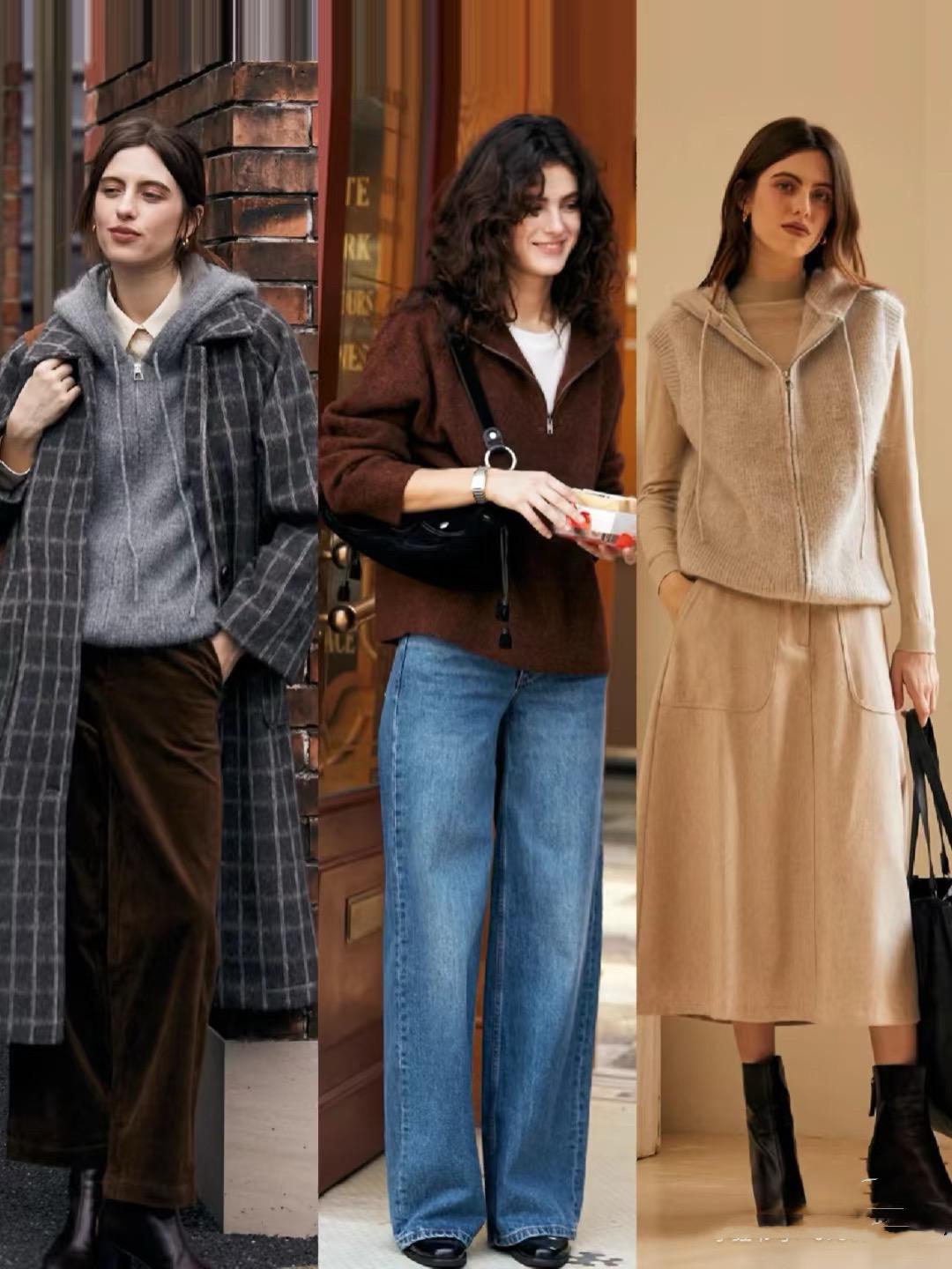 比如羊絨針織衫、羊絨大衣,燈芯絨的直筒褲、挺括的牛仔褲,真皮質地的短靴,都屬於高級且耐看的面料,細節紋理都透着精緻。
