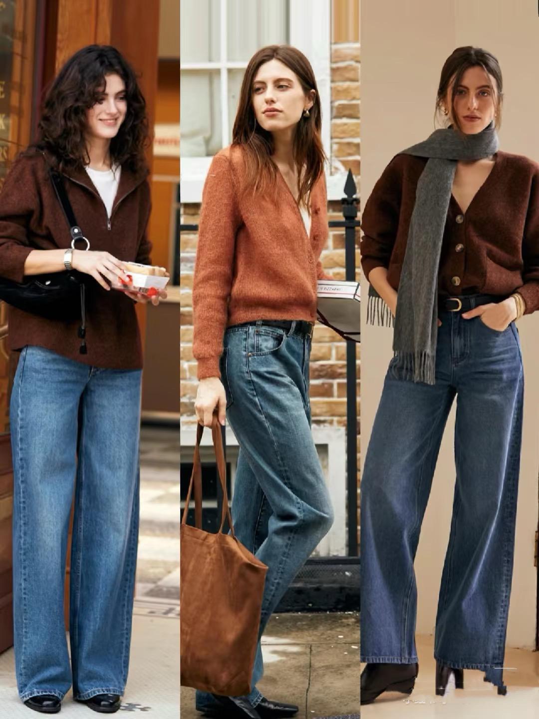 慵懶的棕色針織衫,可以搭配高腰的直筒牛仔褲,簡單流暢又很顯氣質。像這種藍色的直筒牛仔褲,配一雙厚底鞋,真的太顯腿長了。