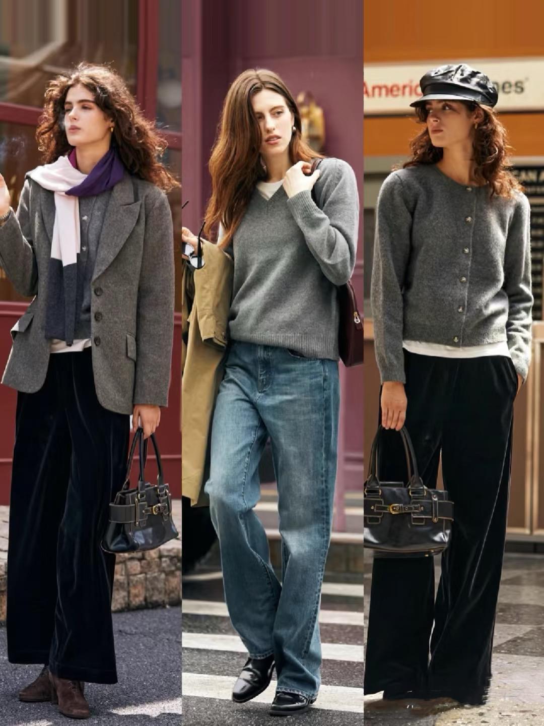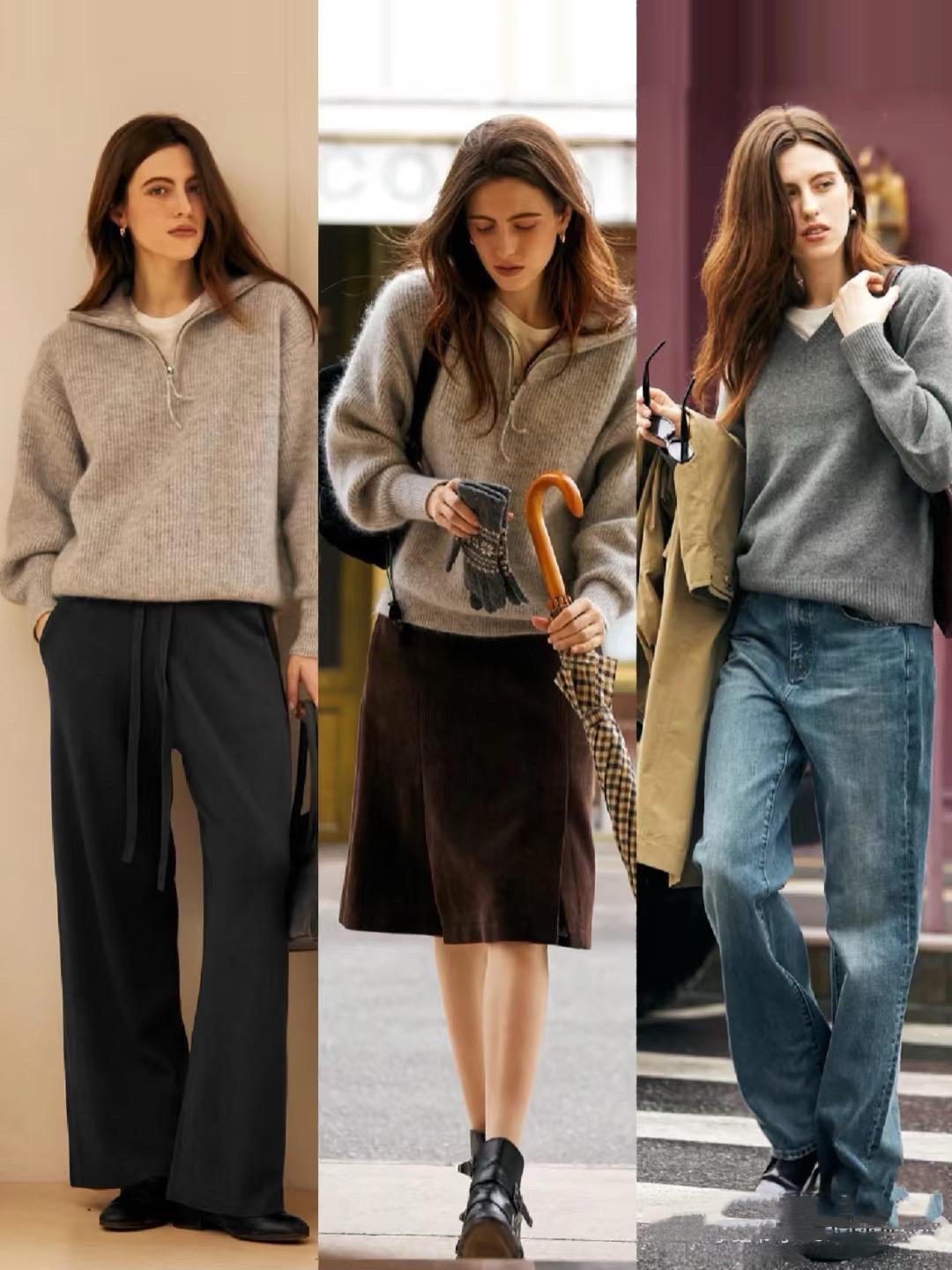 這時候就可以借鑑時髦精的穿搭,就像基礎款的灰色針織衫,可以疊搭白色襯衫/白色T恤,既簡潔又高級。灰色針織衫,配上高腰直筒牛仔褲,顯得大氣又腿長。