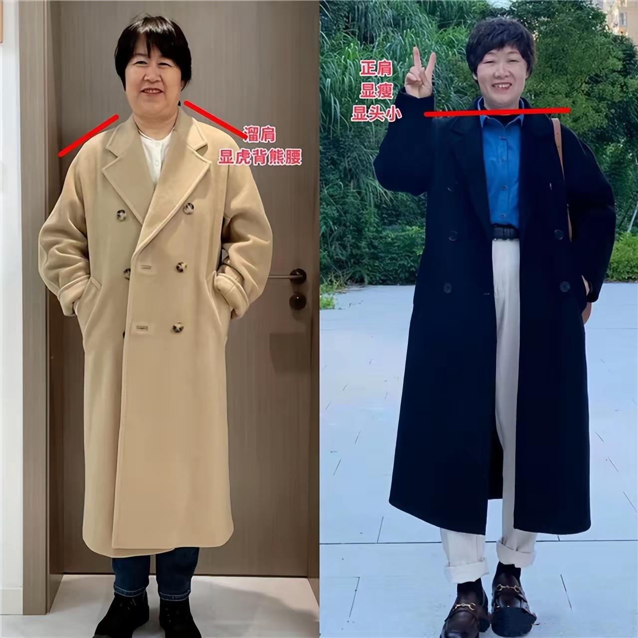 比如選擇溜肩的寬鬆大衣,就會顯得邋遢、而且又一種虎背熊腰的感覺。相對而言正肩的寬鬆大衣,就會顯得更加大氣顯瘦、頭身比也更完美。