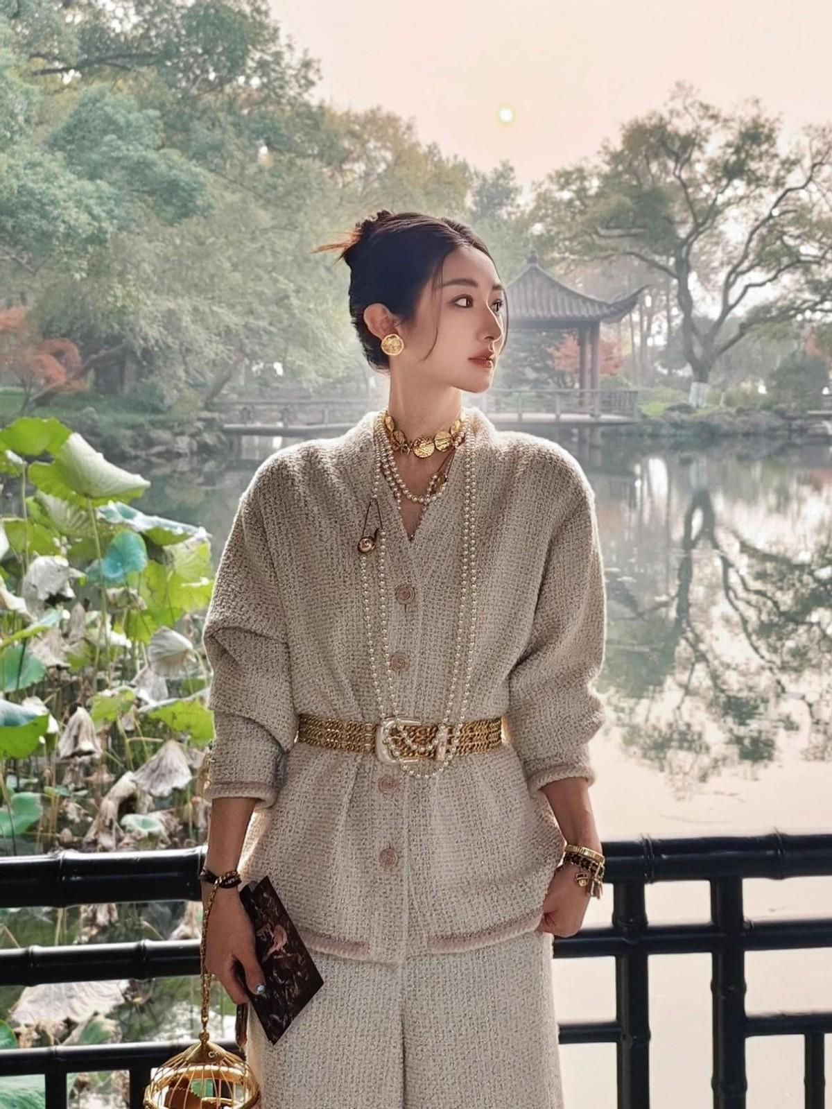 在秋冬一衆簡約幹練的外套中,小香風外套亦柔亦剛,鬆軟中又夾帶着量感。比如薇婭這套白色小香風,純色的優雅大方在套裝中展現出更多質感與高級感。