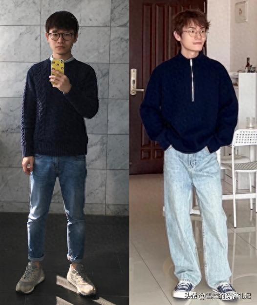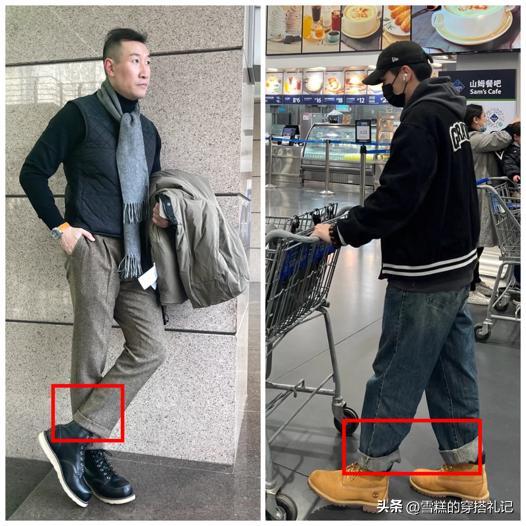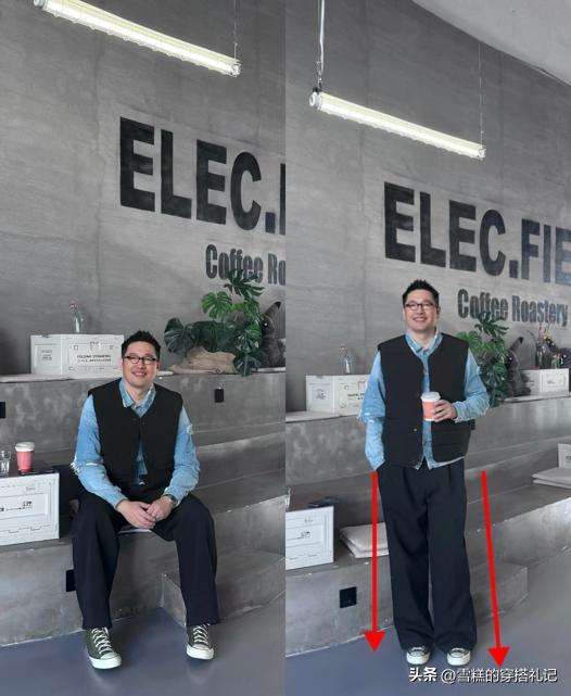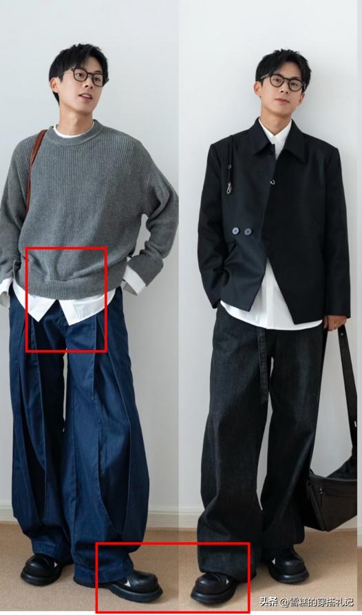 緊身褲的穿搭會讓男人的衣服變得廉價,從上圖的傳達就可以看出,上衣是一件非常有質感的外套,下身搭配的不同版型的褲子,左邊是緊身的褲子,立馬讓衣服的高級感降低,有種撲面而來的土氣感。右邊是換成了直筒的褲子,保留了大衣的質感,又穿出了鬆弛與愜意,讓穿搭呈現出1+1>2的效果。