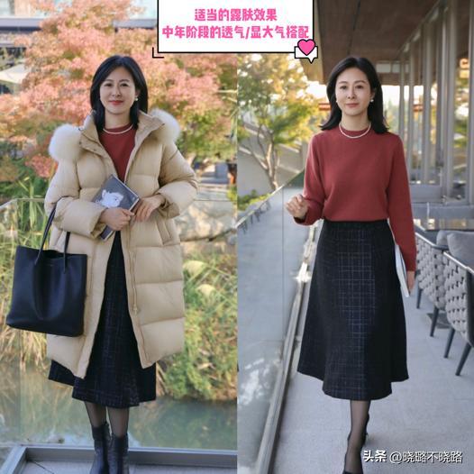 即便是在冬季當中,也不建議各位中年女性將自己全身都包裹起來哦,適當的展露部分的肌膚面積,例如搭配光腿神奇這樣的單品或低領口的設計單品,在視覺上襯顯一定的透氣、層次和氣質上的大氣感。