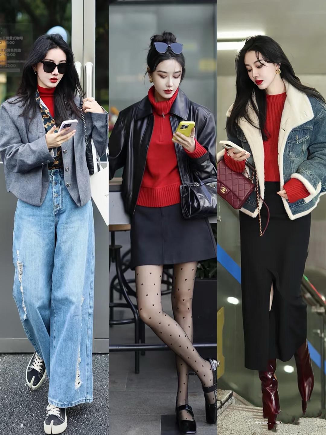 短款的皮衣外套、甚至皮毛一體外套,在這個冬天都可以凹造型。疊搭紅色毛衣/針織衫,很有秋冬氛圍。