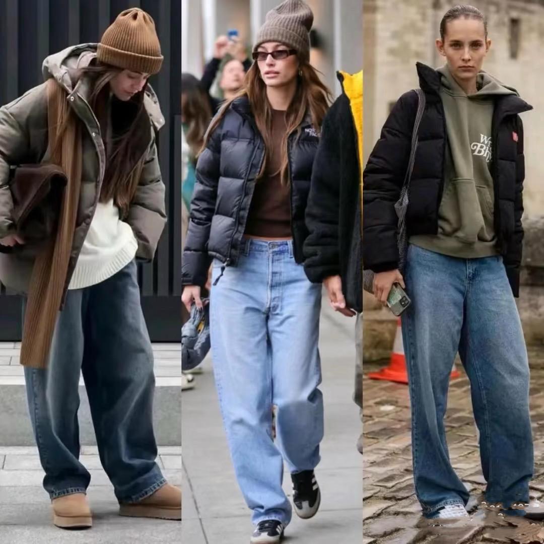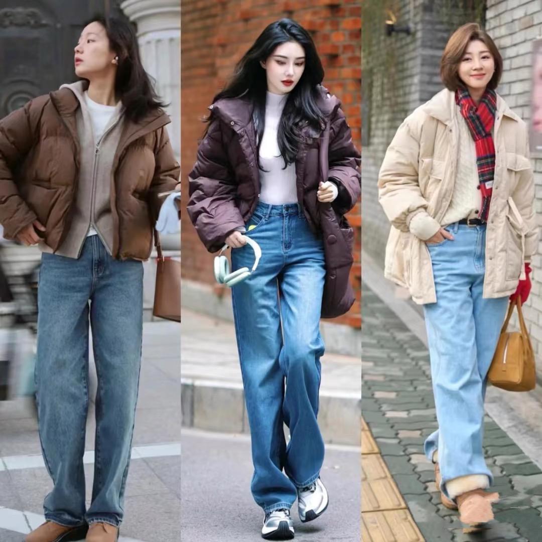 短款的運動風羽絨服,配上高腰的牛仔闊腿褲,簡單而舒適的版型、特別的大氣。寬鬆的短款羽絨服,疊搭連帽衛衣,也洋氣活潑。