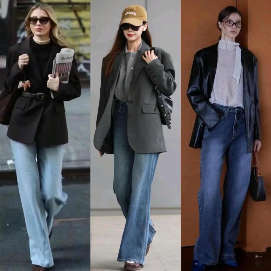 用厚實的西服外套來搭配高腰的牛仔闊腿褲,那種簡潔又流暢的美,真的是帶着少年感英氣。牛仔闊腿褲配復古風西服外套,減齡又顯年輕。