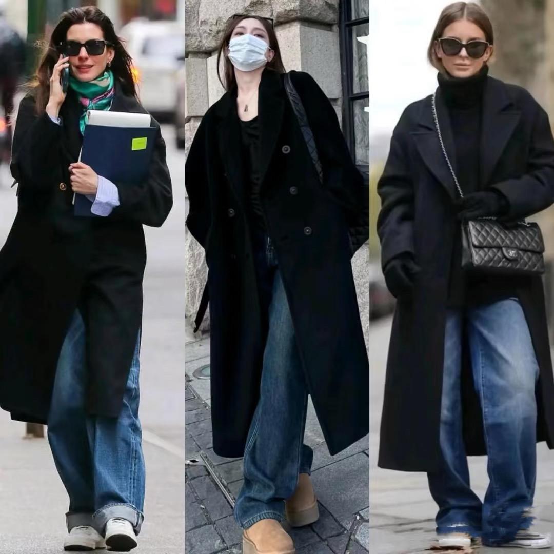 高個子的女生,可以嘗試搭配高腰的牛仔闊腿褲,哪怕褲筒拖地的款式,也不會讓人覺得乏味。這種高腰的牛仔闊腿褲,配黑色長大衣,冷豔又時髦,超級顯腿長。
