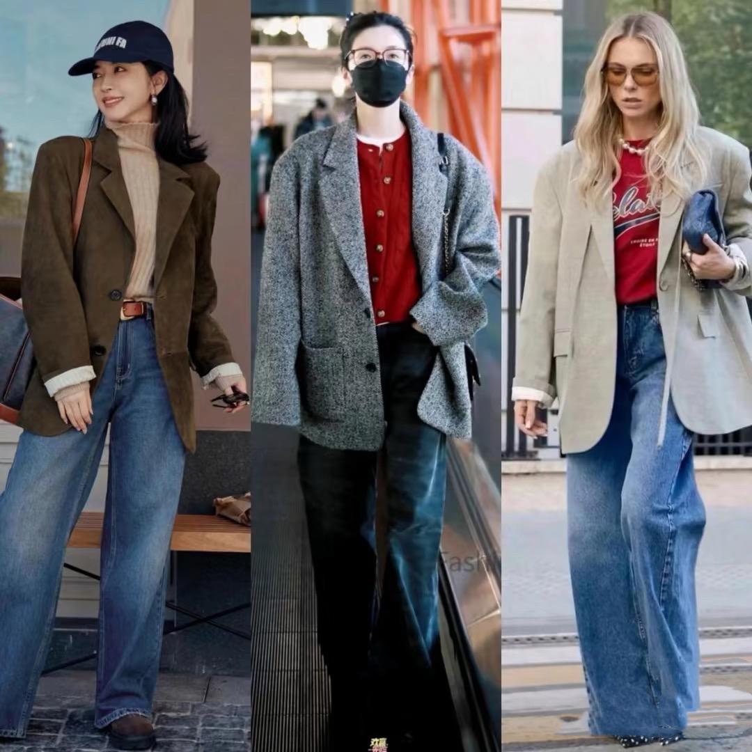 像這種寬鬆的灰色、黑色西服外套,疊搭修身的針織衫、襯衫,都很利落。配直筒的牛仔闊腿褲,美颯又高級。特別適合上班族,牛仔闊腿褲的搭配,也可以弱化年齡感。