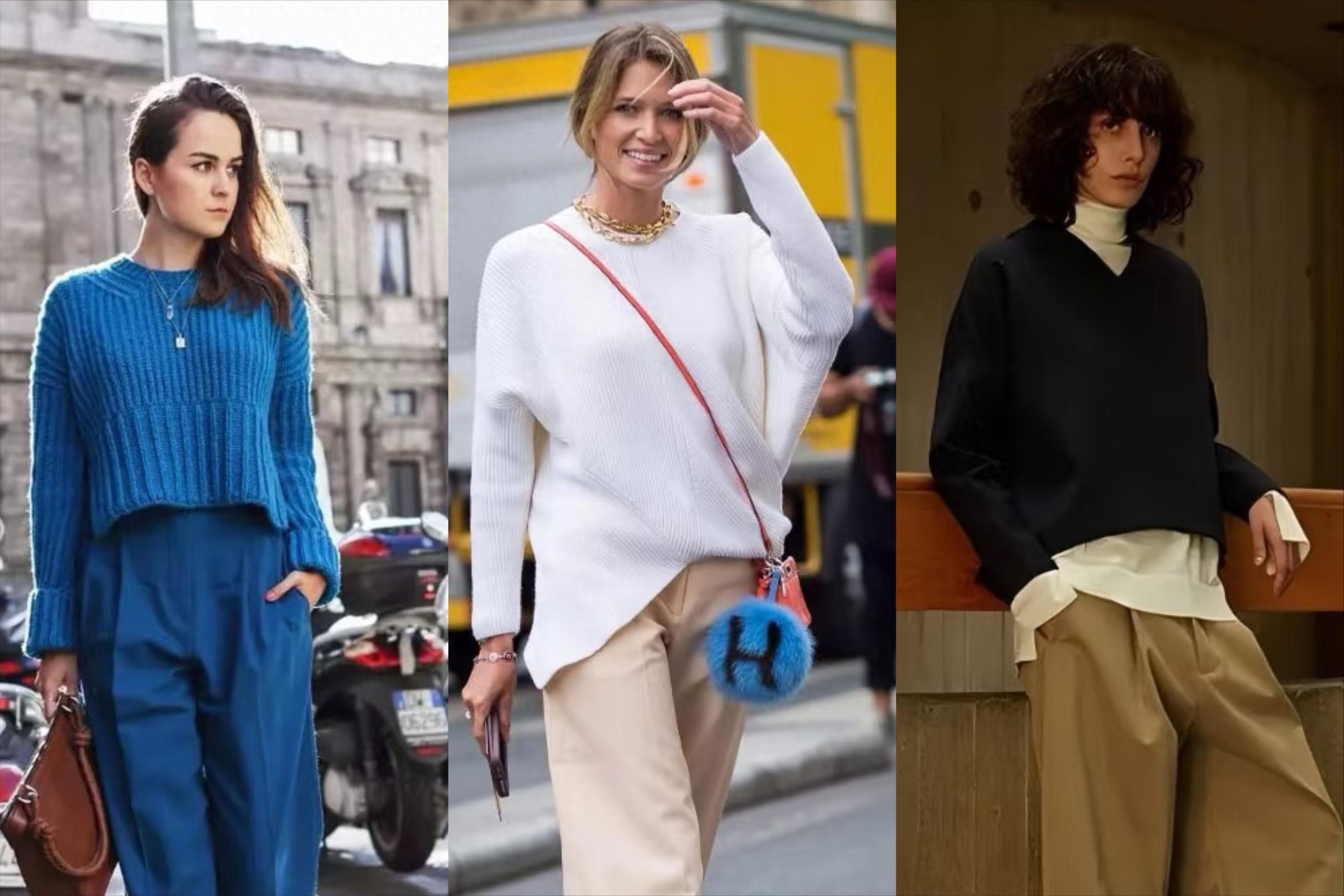 純色系的短款毛衣,可以配高腰的西裝褲,有一種颯美又洋氣的感覺。高腰的闊腿褲,西裝版型更具硬氣,配慵懶風毛衣也很有辨識度。