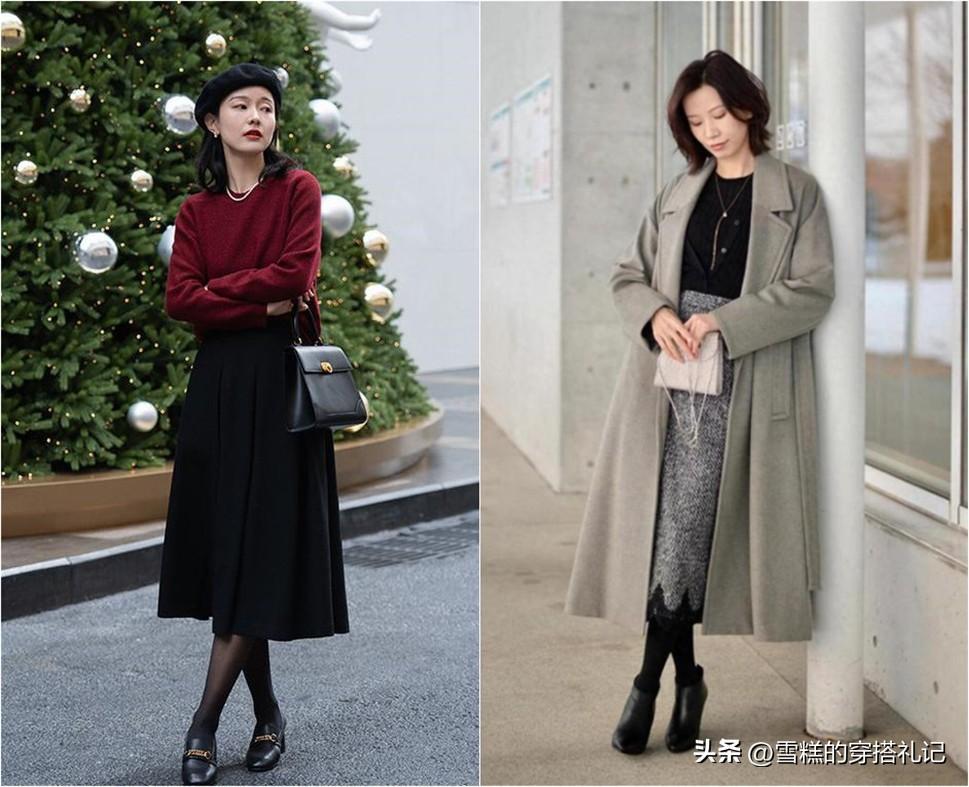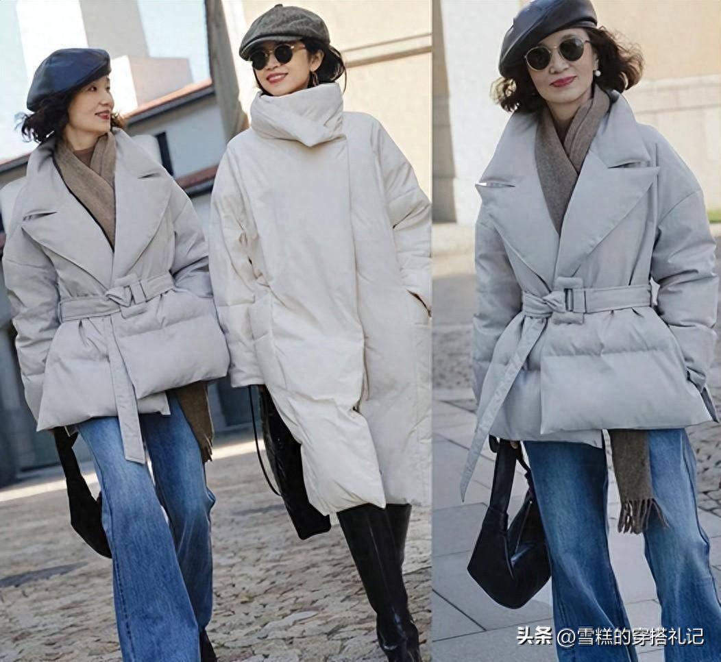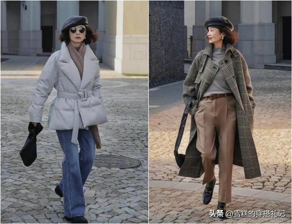 秋冬季節無可奈何一定是以多來取暖的,天氣冷穿衣服不會顯得臃腫難看,祕訣就是注重腰線的塑造了。三木媽媽即使穿着左圖的厚實羽絨服,也照舊能清晰的看到腰線,是因爲選擇了本身帶有收腰設計的外套進行搭配,而下半身也選擇了更能修飾腿型線條的微喇褲來起到延長的效果;而右圖的大衣和毛衣的疊穿,褲子部分也用腰帶來強調突出,並且褲子本身就是高腰的款式,因此穿在身上更顯腰線。