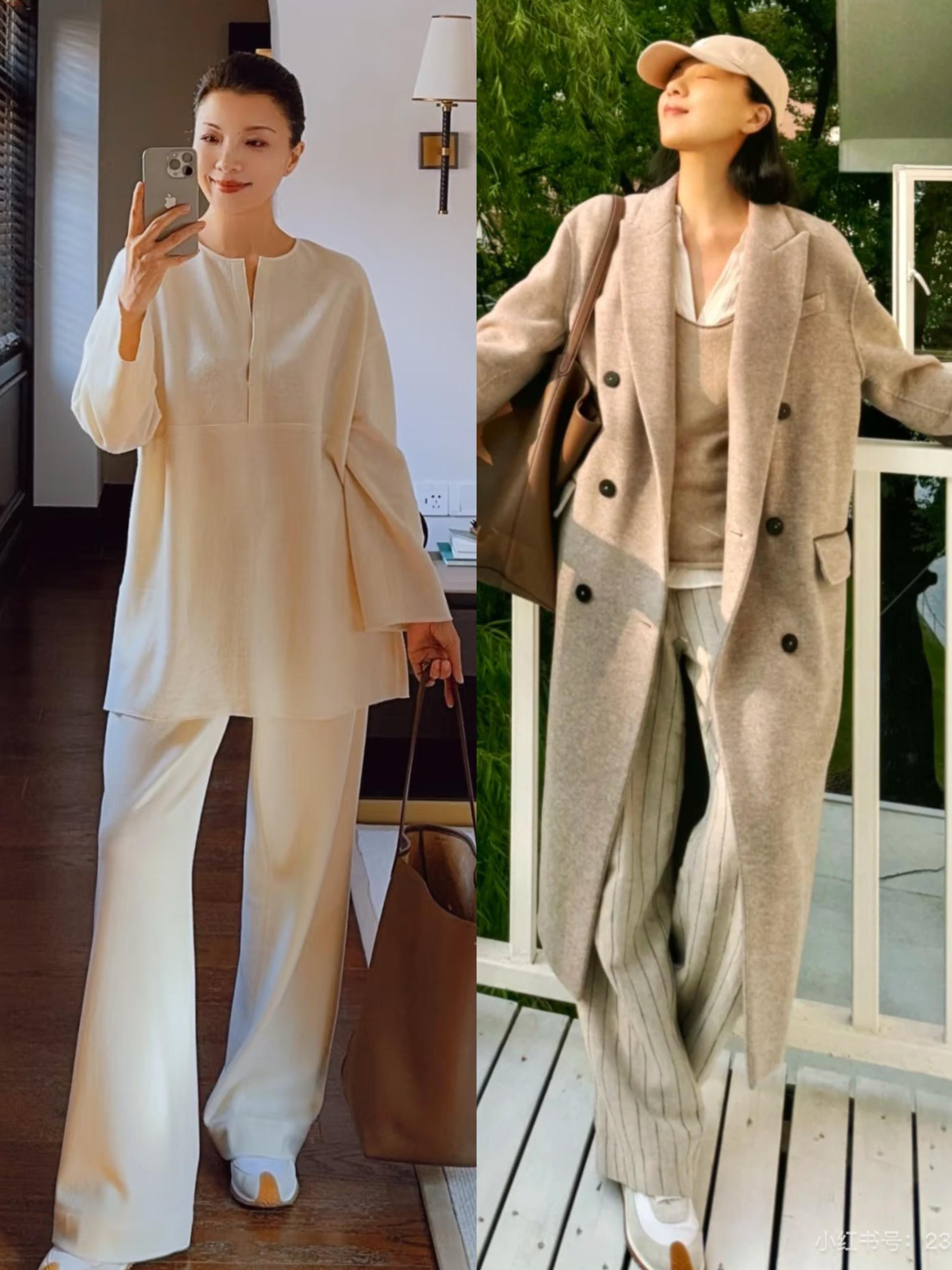 天冷的時候,就穿一身燕麥色,那麼柔和又大方。燕麥色大衣、配上白色襯衫+燕麥色打底衫,領口層次清晰,搭配條紋闊腿褲好洋氣。