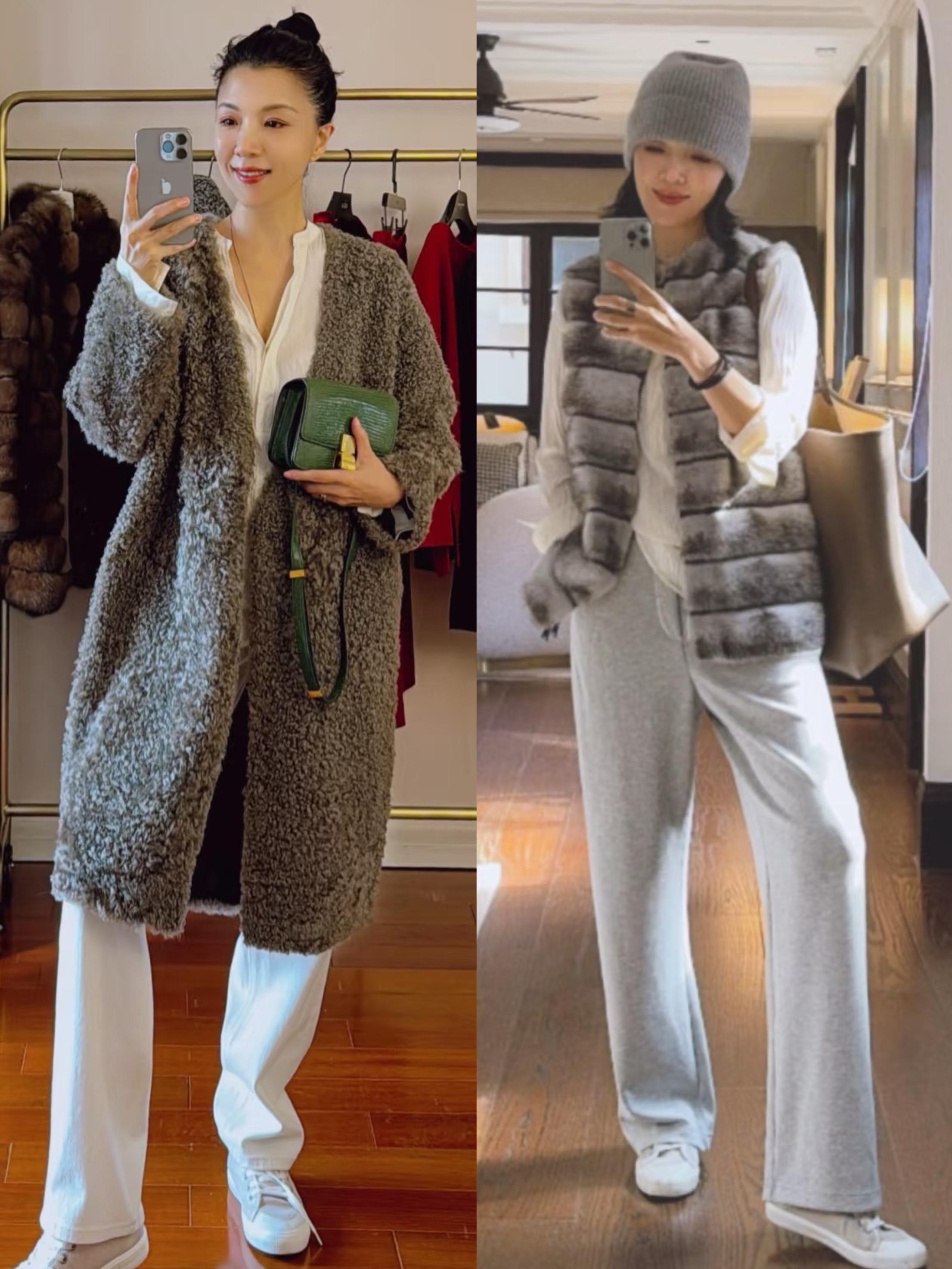 毛茸茸的外套、或者馬甲,更具備冬日氛圍。這位52歲阿姨個子高挑,穿起來完全沒有臃腫感。