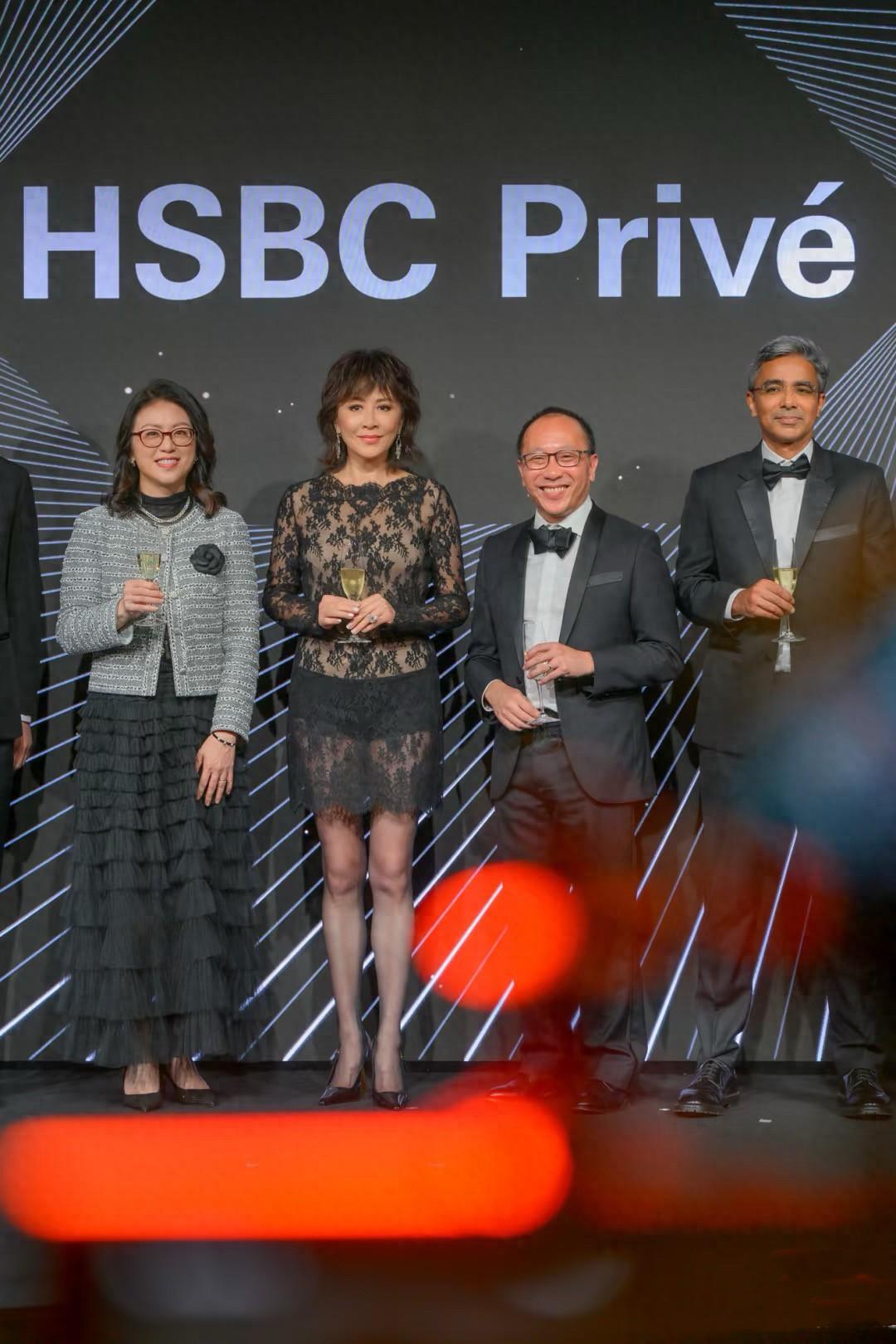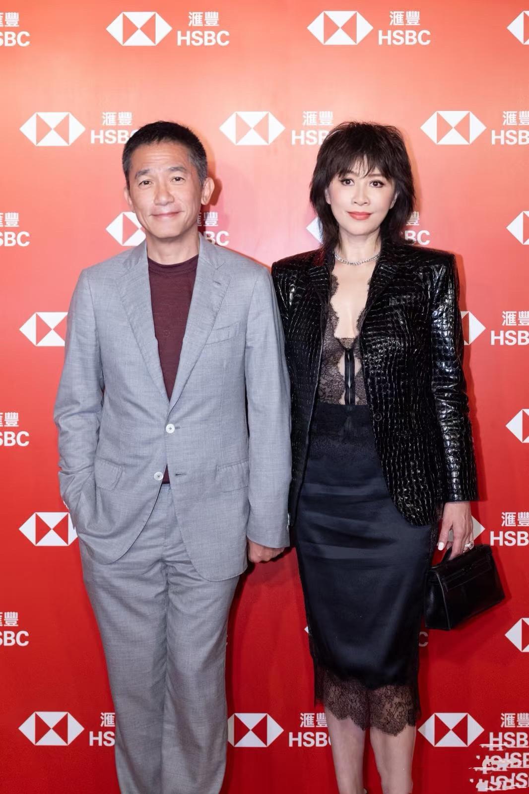 男士穿西服襯衫、系領結。女士穿小香風、高腰褲,而站在C的劉嘉玲穿蕾絲透視裙,性感嫵媚好撩人。