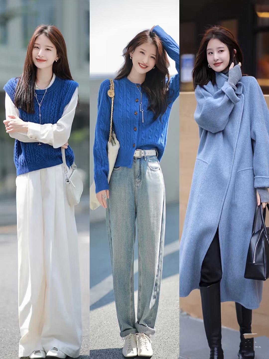 用克萊因藍的圍巾,搭配復古風的高腰牛仔褲,可以顯得雙腿又細又直。復古藍的直筒牛仔褲,面料更硬挺。帶着高級感、也特別的大氣。