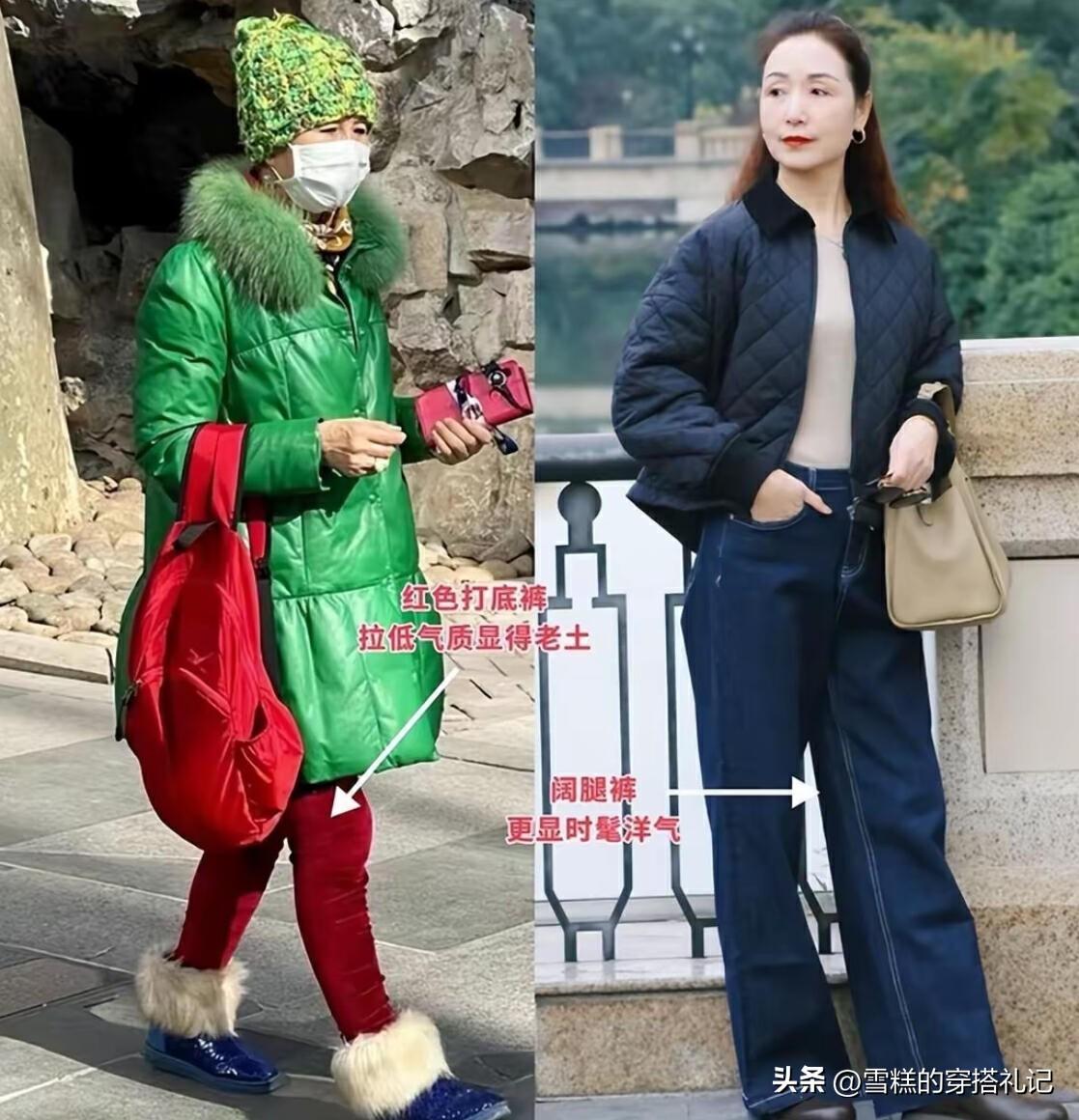 大齡女人冬天穿羽絨服的時候,其實就可以體現出個人審美,而一個人放任老態的體現,就是穿羽絨服配打底褲、戴老人帽,不僅顯老還特別沒氣質。