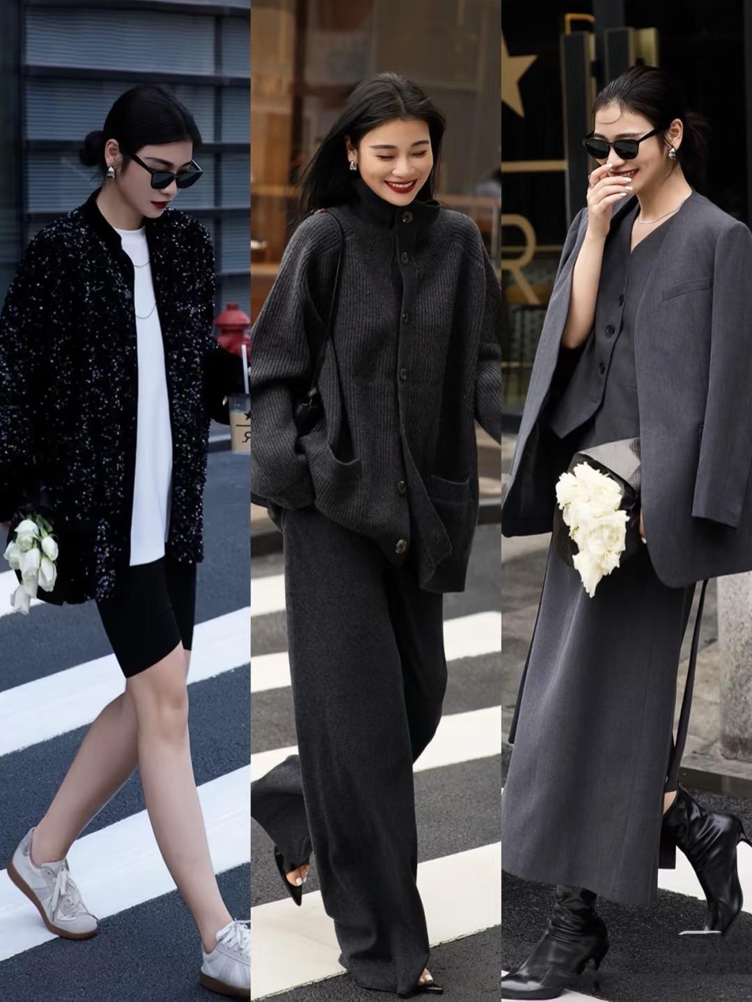 極致沉穩的黑、乾淨清爽的白,混在一起就是高級優雅的灰。黑白色、同屬於冷色調,所以黑色系自帶清冷貴氣感。