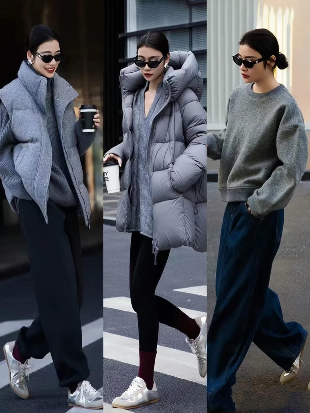 淺灰色乾淨溫柔、有一種小女生的安靜和恬淡。淺灰色的羽絨服、打底褲,與白色系的T恤、運動鞋更配。