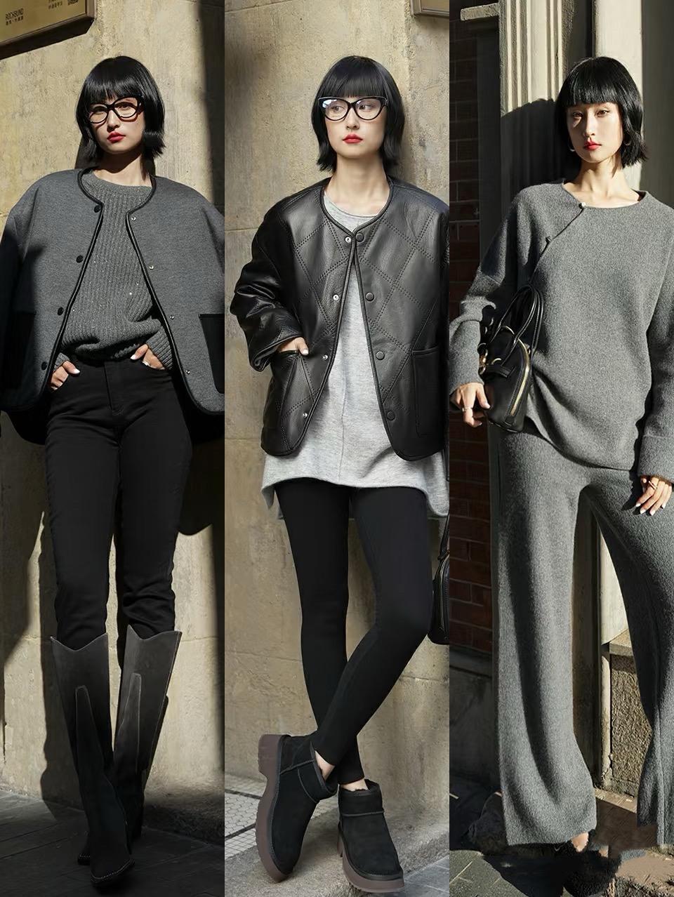 以深灰色毛絨質感的套裝,有一種溫潤典雅的美,國風盤扣帶來素雅嫺靜之姿。而深灰色小香風外套、豎坑條針織衫、小黑褲的搭配,則復古內斂,高級清冷。