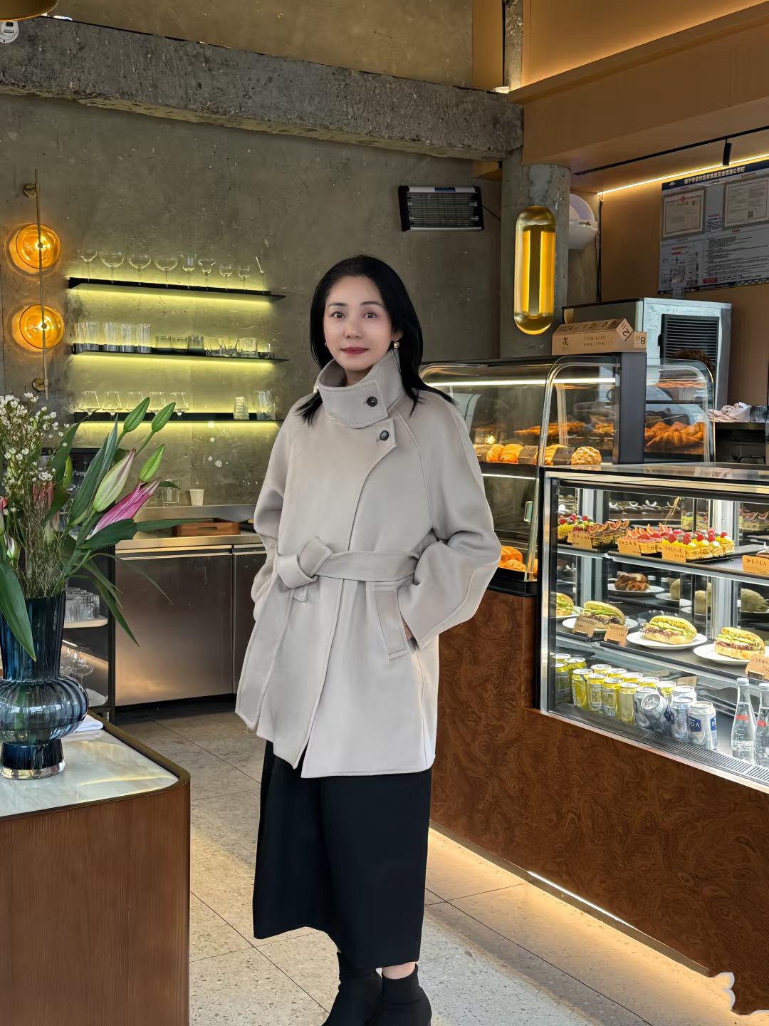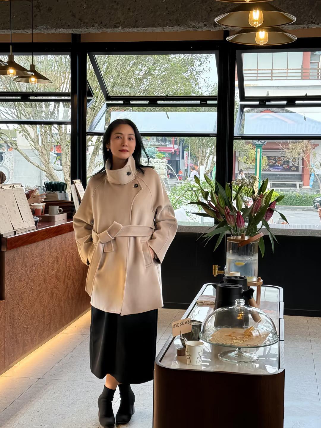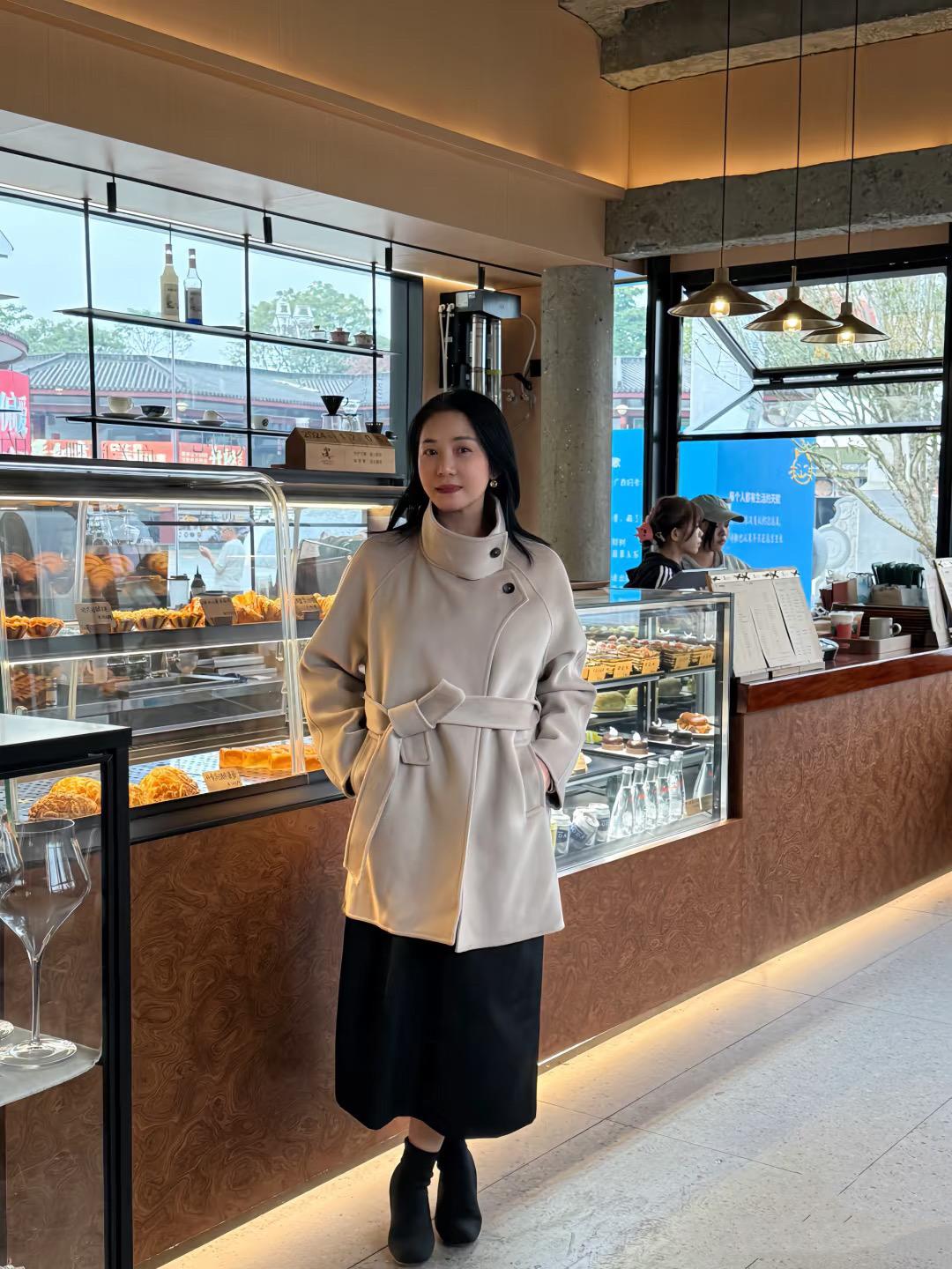 這不,天冷的時候我又買了一件米白色的大衣,姐妹們直誇我眼光好。這件大衣款式比較個性、長度也適中。