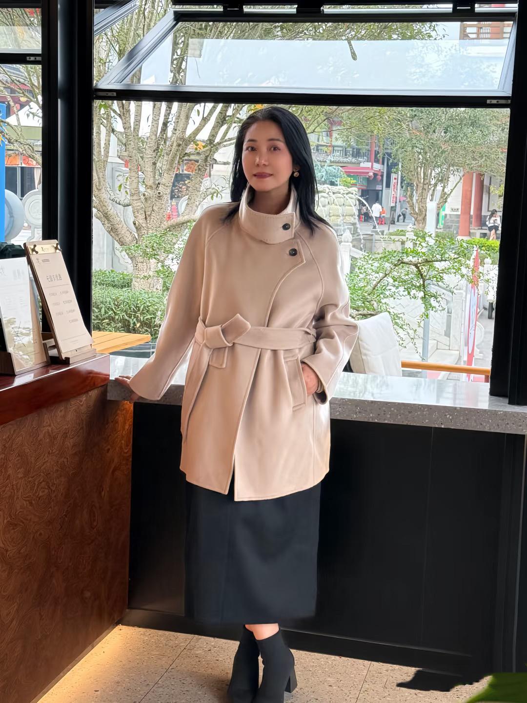 豎領的款式,防風保暖性也特別的強。這種豎領款的大衣、其實更適合脖頸線條修長的女人。如果你的脖子不夠長,也可以選擇將豎領放下來。