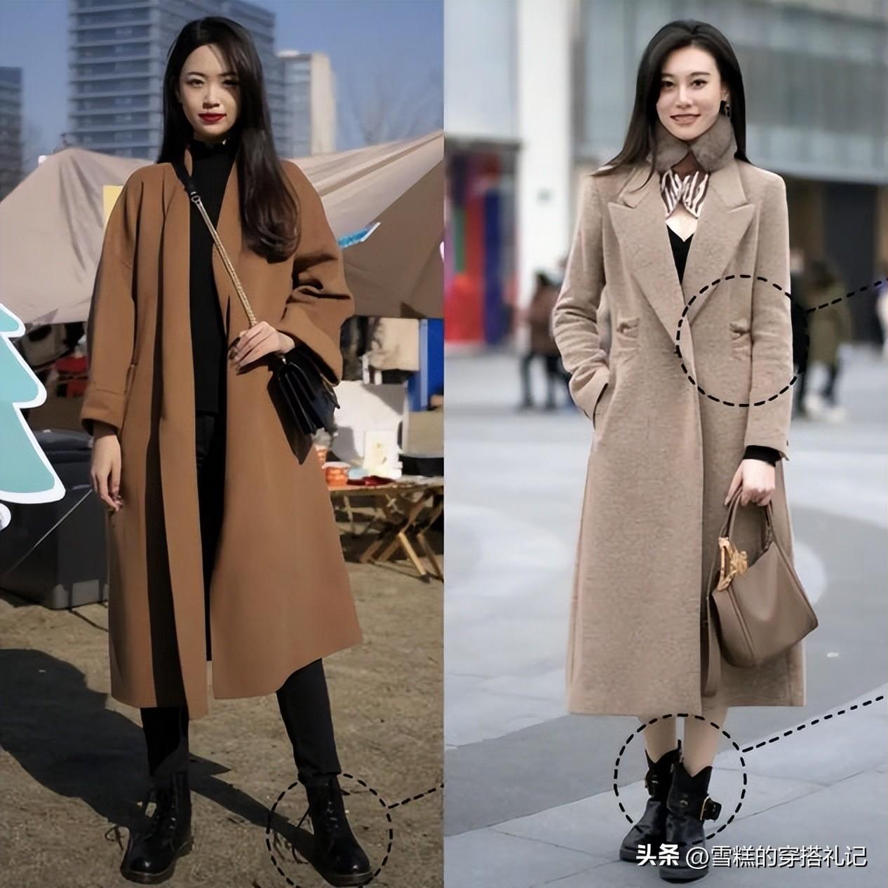 冬季的加長款是靴子的用處,也特別的大,長靴的靴筒可以選擇的寬鬆一點,方便我們預留出一些塞褲腳的空間。或者偶爾我們可以利用長靴去遮擋住打底褲的底色,這樣長靴的視覺佔比就更多了,也更能夠彰顯出靴子質感的妙處,用來呼應你的大衣面料,剛好有着不同面料混搭的時尚感,這也是我們可以參考的一個穿衣服的小妙招。