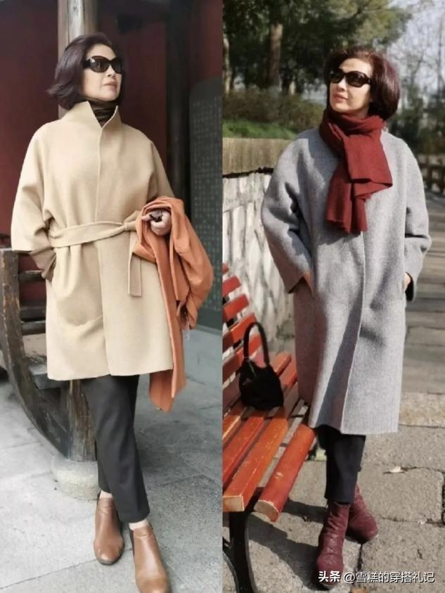 中年女人在駕馭大衣的時候,如果選用的是長款的直筒褲,那我們直接選擇裸靴的款式去延展你雙腳部分的線條就剛剛好,大領口的穿法會顯得疊穿造型更加從容,領口怕冷的話就疊加圍巾,造型的時尚感和分寸感都展現的乾淨利落,而且這一套造型是相當保暖的,比穿打底褲更加實用。
