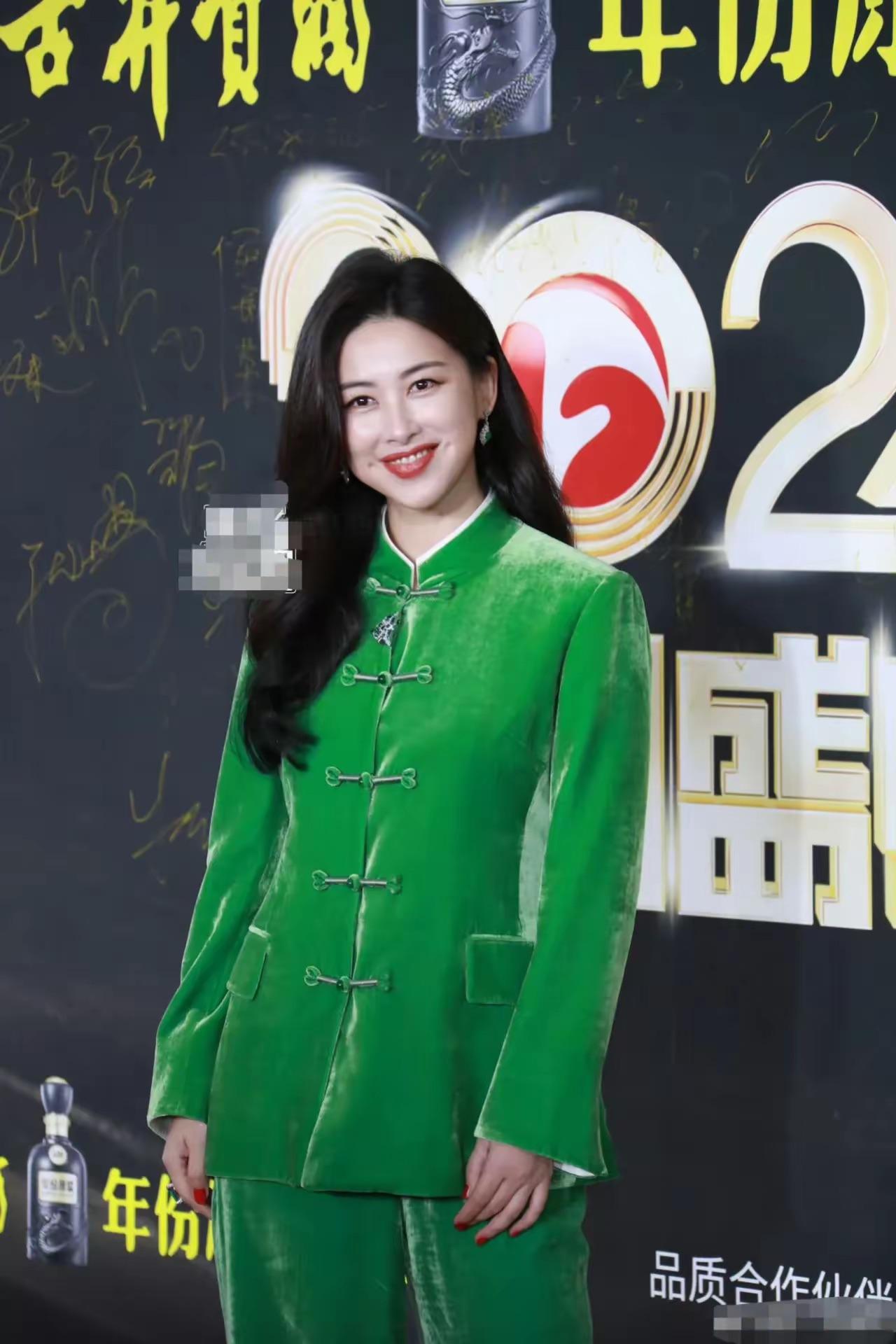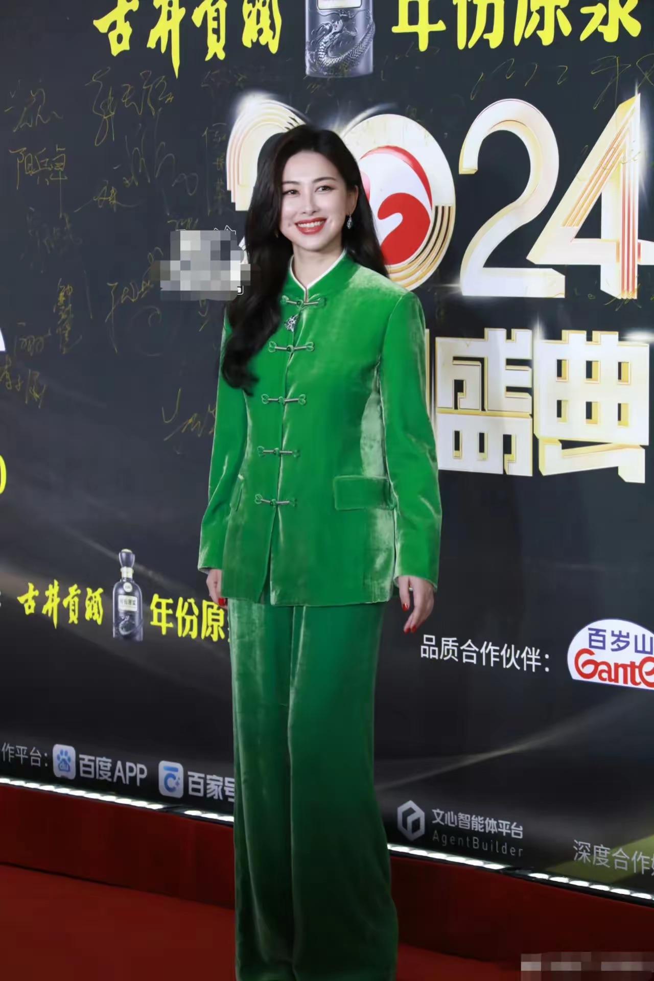 大概是上了年紀,穿衣搭配上更含蓄內斂了。她穿着綠色系的絲絨套裝,中式禮服設計包裹嚴實,是一種很大氣且低調的美。