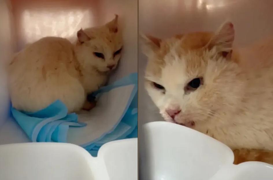 被解救出來的兩隻貓咪完全沒有劫後餘生的驚喜,反倒透過它們的眼神,看到了它們在遭遇到創傷後的麻木和絕望。