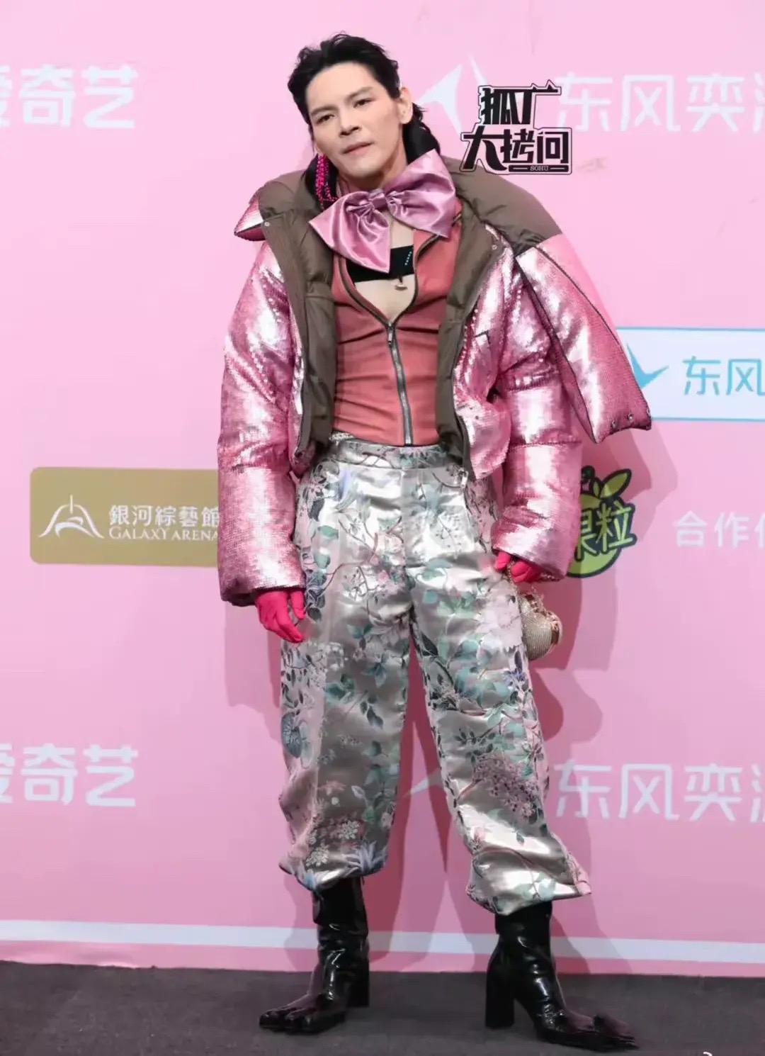 粉色的羽絨服、拉鍊的緊身衣、手指寬的遮羞布,還繫了誇張蝴蝶結,踩着高跟的短靴,這一組造型、一言難盡、真的是辣眼睛。