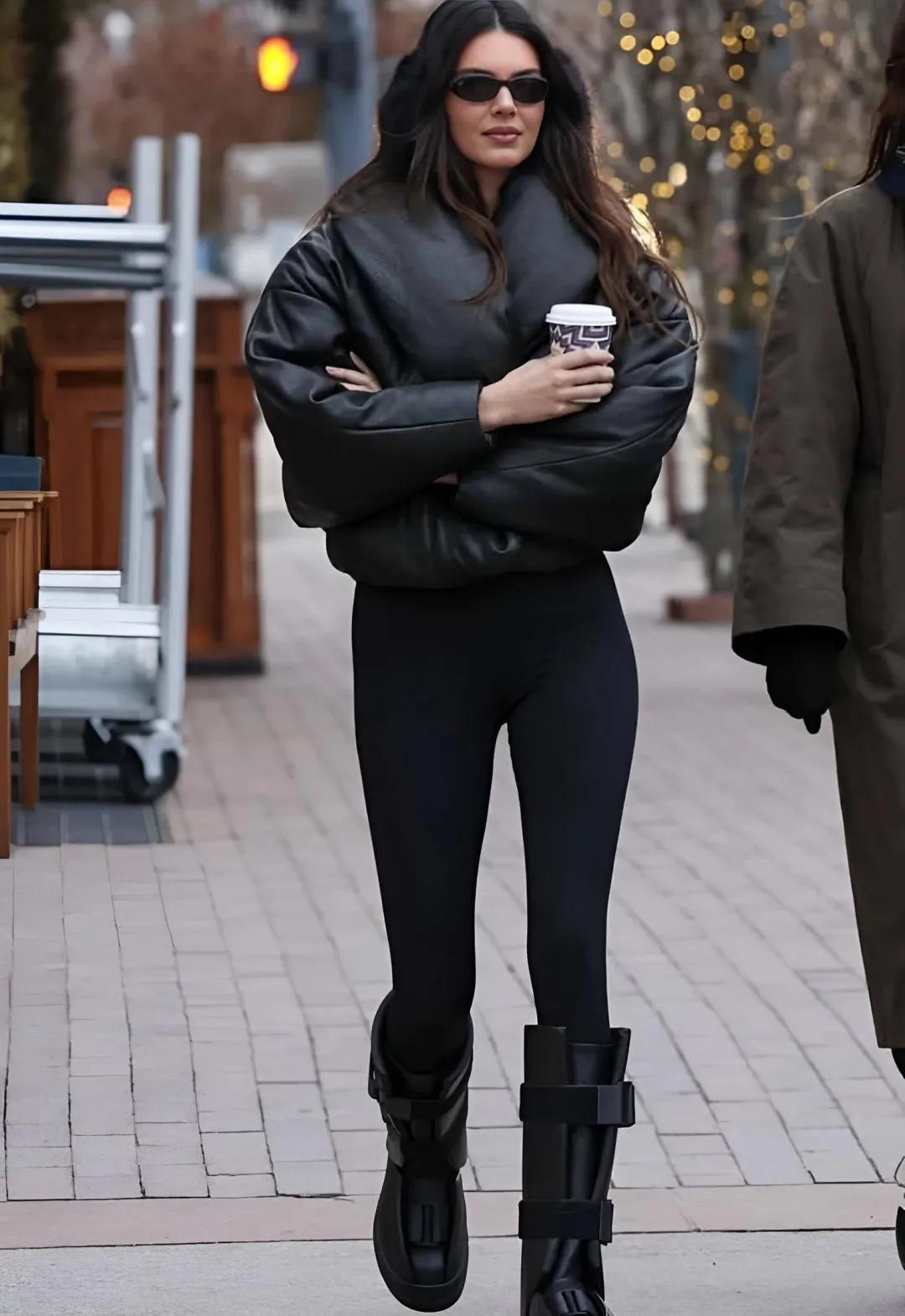 一身黑色系的打扮,視覺上看起來就非常顯瘦,黑色短款羽絨服,很百搭經典的一個顏色,選擇了一條黑色瑜伽褲來配,上下同色的搭配,看着就非常顯瘦,還配了一雙黑色馬丁靴,有種酷帥感,率性又不失溫度的打扮。