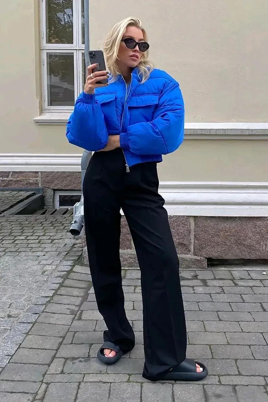 當你穿膩了黑白色羽絨服,那麼一定要試試這種亮色的,深藍色的短款羽絨服,很明豔的色調,能很好驅散冬日的沉悶。搭配一條黑色高腰闊腿褲,十分適合小個子女生的搭配,也能將大女人的氣場給營造出來,褲子和鞋子顏色一致,腿部線條瞬間被拉長了。