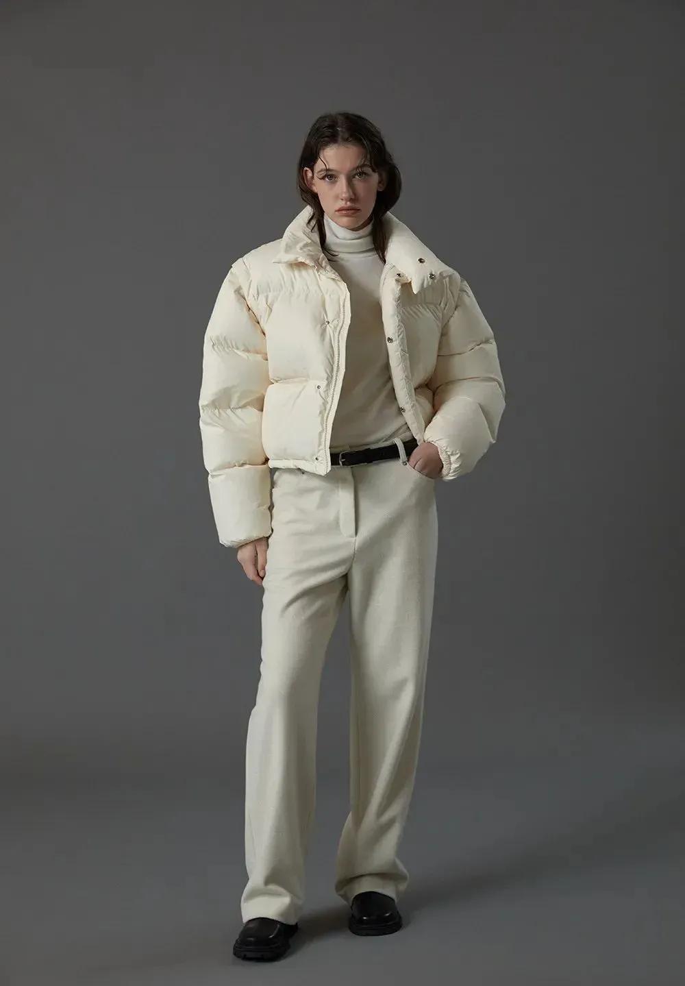 喜歡這種奶奶的白色,它沒有純白色那般難hold 住,這個顏色更多了幾分溫柔,利落的短款,超級適合小個子女生的,內搭一件高領打底衫,可太保暖了,下身選擇了一條白色闊腿褲,既不會出錯,又很顯高級,減齡的同時又帶着幾分氣質,完全不會給人累贅與臃腫感。