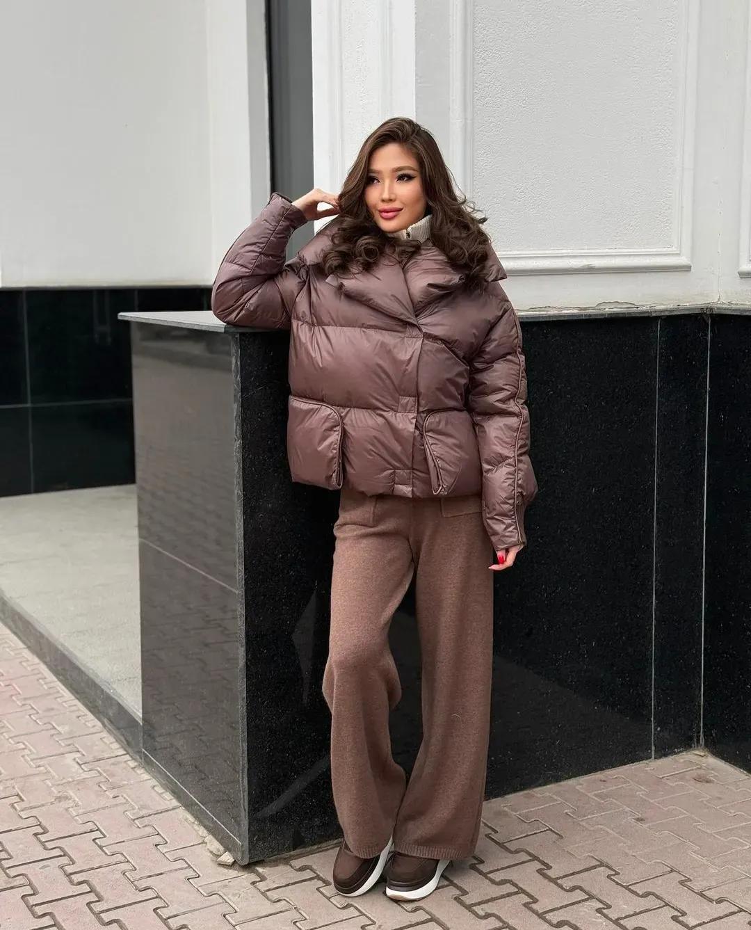 在冬天,棕色的單品都特別具有氛圍感,利落的短款棕色羽絨服,內搭選擇一件白色針織衫,看起來就非常保暖,下身配一條棕色羊絨闊腿褲,將那種漫不經心和鬆散都呈現出來,再選擇一雙咖色運動鞋,氣質感十足。
