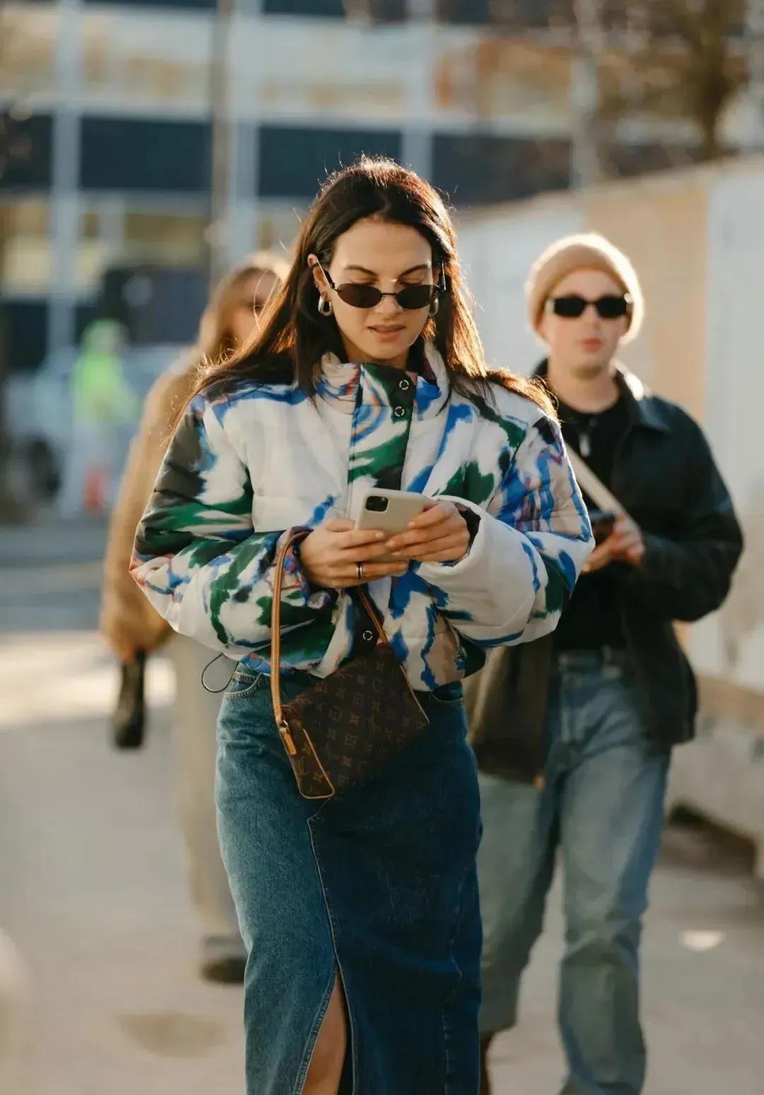 這種花色的短款羽絨服,雖然看起來有些花哨感,但只要選對內搭和配對下裝,就完全沒有問題。選擇一條藍色牛仔半身長裙,很大方氣質又不失得體的造型,讓你舉手投足間都盡顯高級,有種很低調的美感。