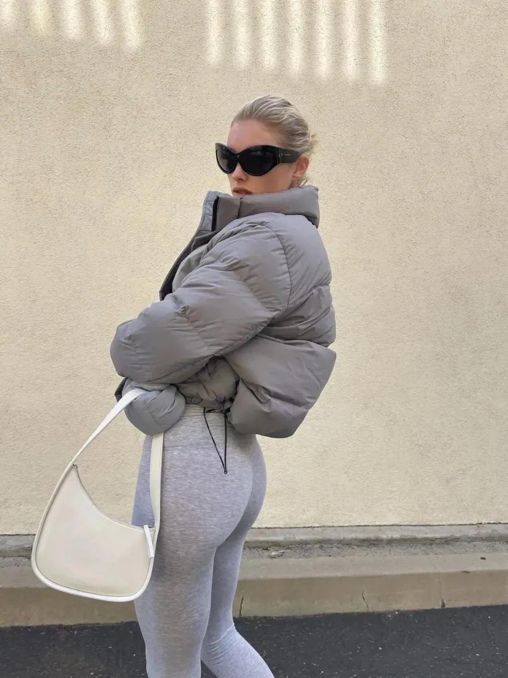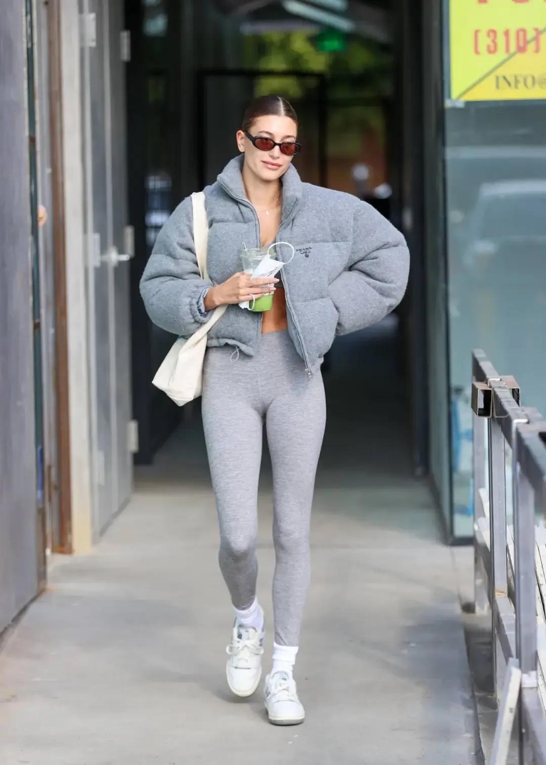 灰色系的短款羽絨服,這個顏色看起來還挺高級的,很顯利落的款式,搭配一條灰色瑜伽褲,雖然整體都是灰色,但是有層次,整個着裝看起來輕鬆自信,還不失率性和顯瘦,不管是日常通勤,還是其他場合都是很合適的。