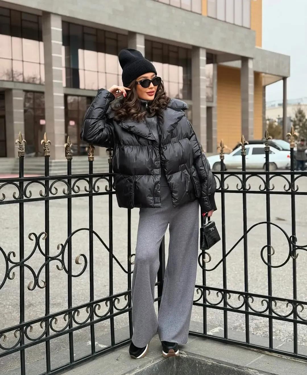 經典黑色短款羽絨服,這個色調實在是太百搭和耐看了,超級適合冬天的,內搭配一件灰色針織外套,就可以讓你看起來非常保暖,選擇一條灰色羊絨闊腿褲,這麼穿真的太保暖了,不僅顯瘦,還很好展現出一種自然與鬆弛。