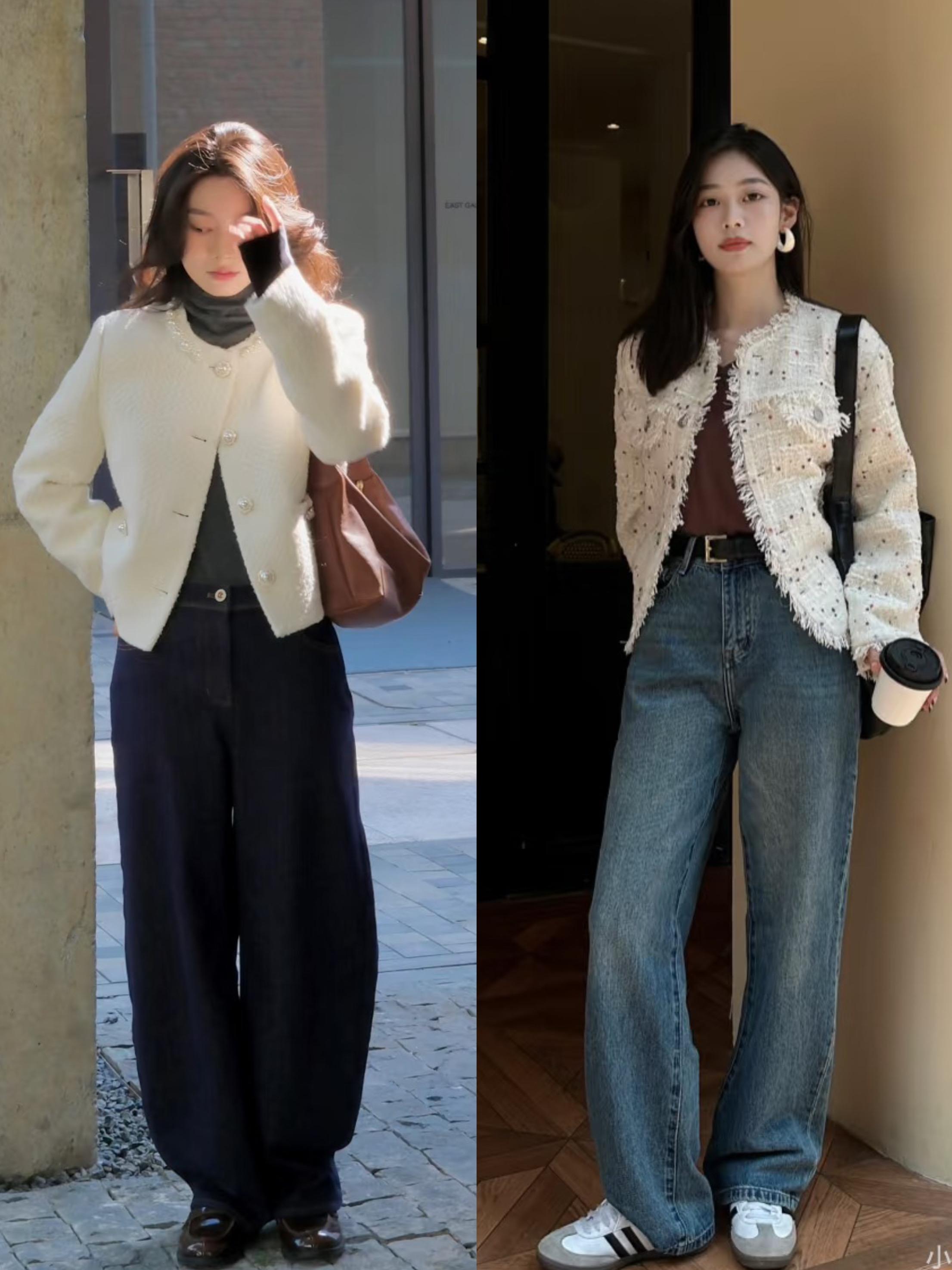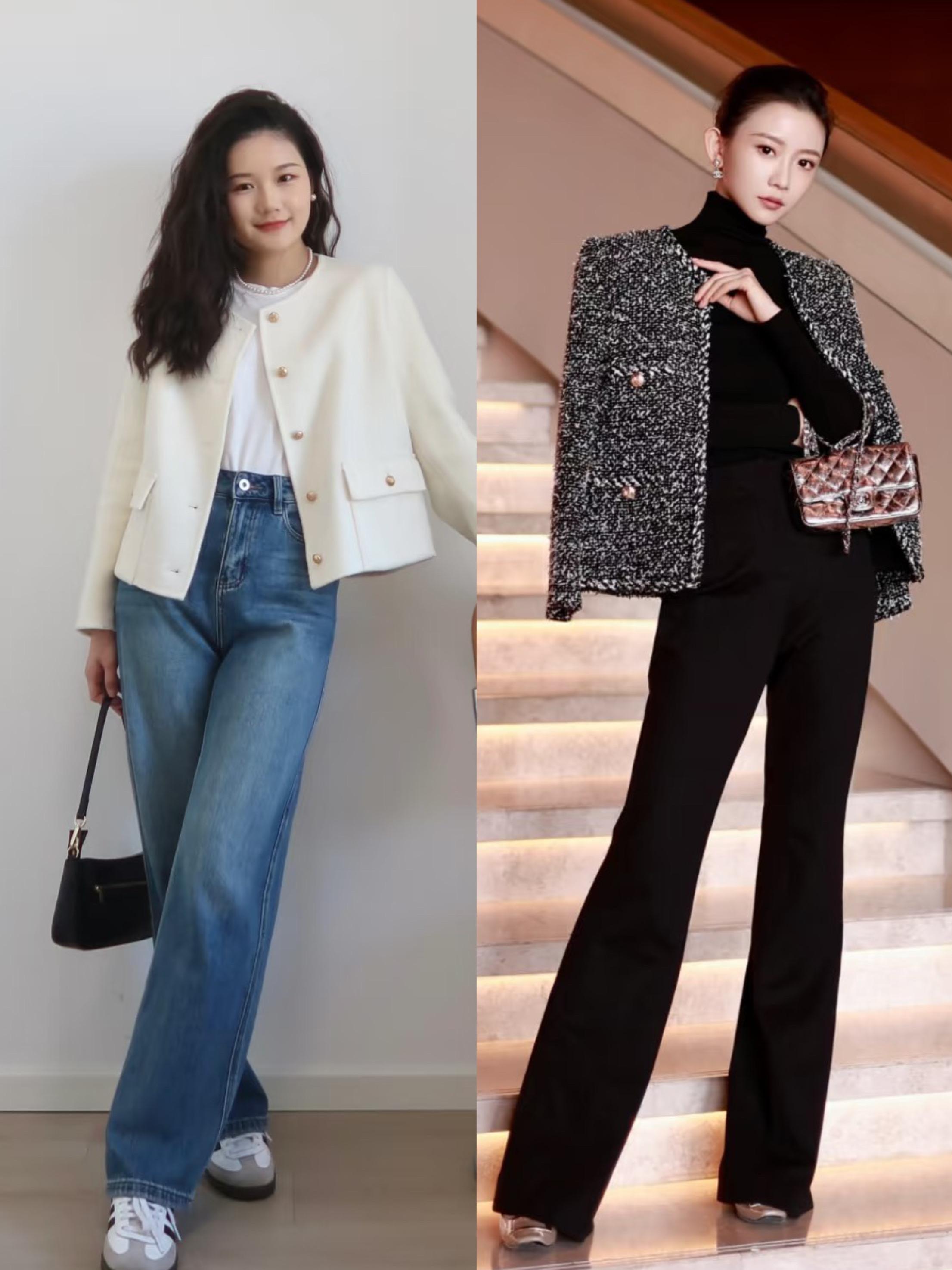日常的穿搭,如果不是出入特別正式的場合,我們都可以將小香風拆分開來穿。一件小香風外套,可以配微喇褲、也可以配牛仔褲。
