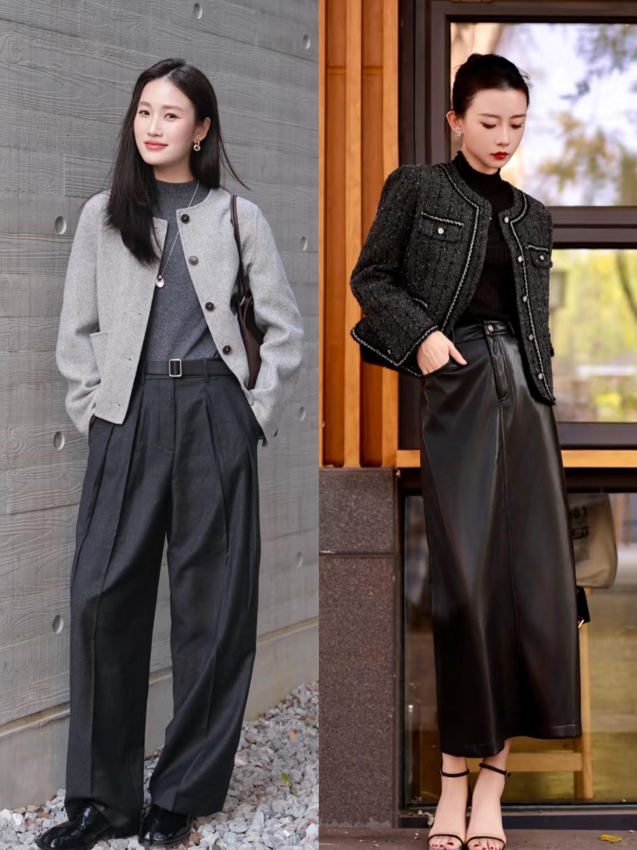 看似精緻體面的小香風外套,可以配高腰的皮裙來穿,又美又颯也很惹眼。過膝的半身裙、皮革質地,防風保暖又很顯瘦。