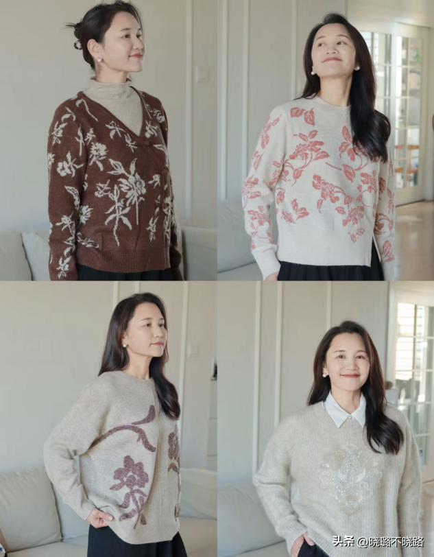 不管選擇一件套頭毛衣還是開衫毛衣,五六十歲的女人都會面臨身材發福顯胖的問題,其實不用焦慮,直接對症下藥就好!包括性比較強的小領口和高領毛衣對鉑金短粗的女人非常不友好,顯得人又矮又胖,建議換成脖頸處露膚比較多的V領、U領毛衣,降低全身的厚重感。