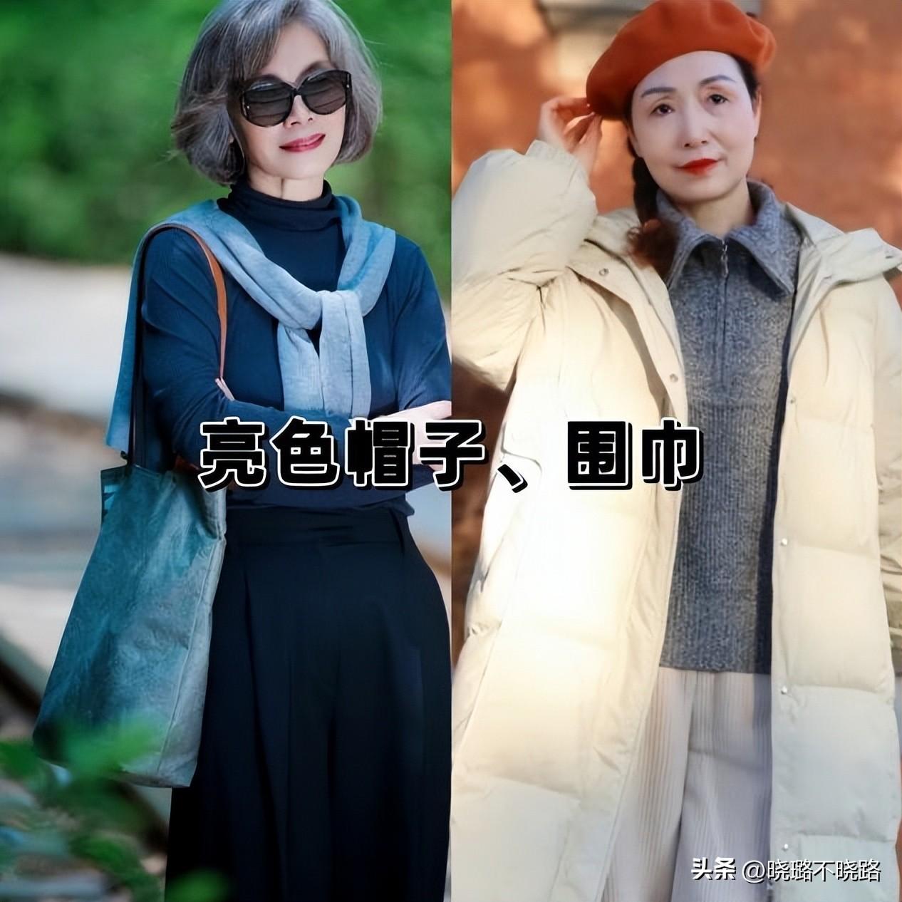 上了年紀的女人也可以多嘗試一下亮色,給自己的搭配注入更多的時尚感。但是不建議大家大面積的穿亮色的大衣褲子,小面積的亮色反而能夠製造氛圍感。比如基礎色的服裝,配上亮色的帽子圍巾,瞬間突出了時尚感。而且像酒紅色的圍巾和帽子足夠的顯白,可以稀釋面部的暗黃色。